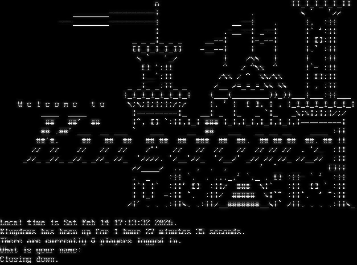 o [I_I_I_I_I_I] _​_______----------\| . \\ \` '// -​--________----------\| _​_--\| . \|. :\|\| \| .​-__--\| _--\| \|\` ':\|\| _ _ _\|_ _ _ _​_--\| \|-​_--\| \| []:\|\| [I_I_I_I_I] -​__--\| \| \| \|.\` :\|\| \\ \` '_/ \| /\\\\ \| \| :\|\| [] ':\|\| ^ / ^\\\\ ^ \|\`- :\|\| \|__\`:\|\| /\\\\ / ^ \\\\/\\\\ \| []:\|\| _ _\|_ _:\|\|_ _ /__ /=​_=_=_\\\\ \\\\ \| , :\|\| \|_I_I_I_I_I_I_\| (___(_​_______))_))___\|___:\|\|___ W e l c o m e t o \\;\\;\|;\|;\|;/;/ \|. ' \| [ ], \| , \|_I_I_I_I_I_I_\| _​___ _​___ \|-​--------\|_ __\| _ \|_ _ \`\|_ _\\;\\\|;\|;\|/;/ ## ##' ## \|^, [] \`:\|\|,\|_\| ### \|_\|,\|_\|,\|_\|,\|_\|,\|-​--------\| ## .##' ___ __ ___ \` ___ __ ## ___ __ __ __ _​___ :\|\| ##'#. ## ## ## ## ## ## ### ## ##. ## ## ## ##. ## \|\| // // // // // /'' // // // // // // // . '/_ :\|\| _//_ _//_ _//_ _//_ //_ '////. '/__'//_ '/__/' _// // //_ //__// :\|\| //_​___/ .. , . , ' \` []\|\| , _ :\|\| \`. . .​.._,' \`,_ . [] :\|\|- \` ' :\|\| \|\`\| \|\` :\|\|' [] :\|\|/ ### \\\|\` :\|\| [] \` :\|\| \| \|_\| -:\|\| \`. :\|\|/ #​#### \\\|\`^ :\|\|\`. ' ^:\|\| /\|' . . .:\|\|\\. .:\|\|/_​_#######__\\\|\` /\|\|. . . .:\|\|\\_ Local time is Sat Feb 14 17:13:32 2026. Kingdoms has been up for 1 hour 27 minutes 35 seconds. There are currently 0 players logged in. What is your name: Closing down.