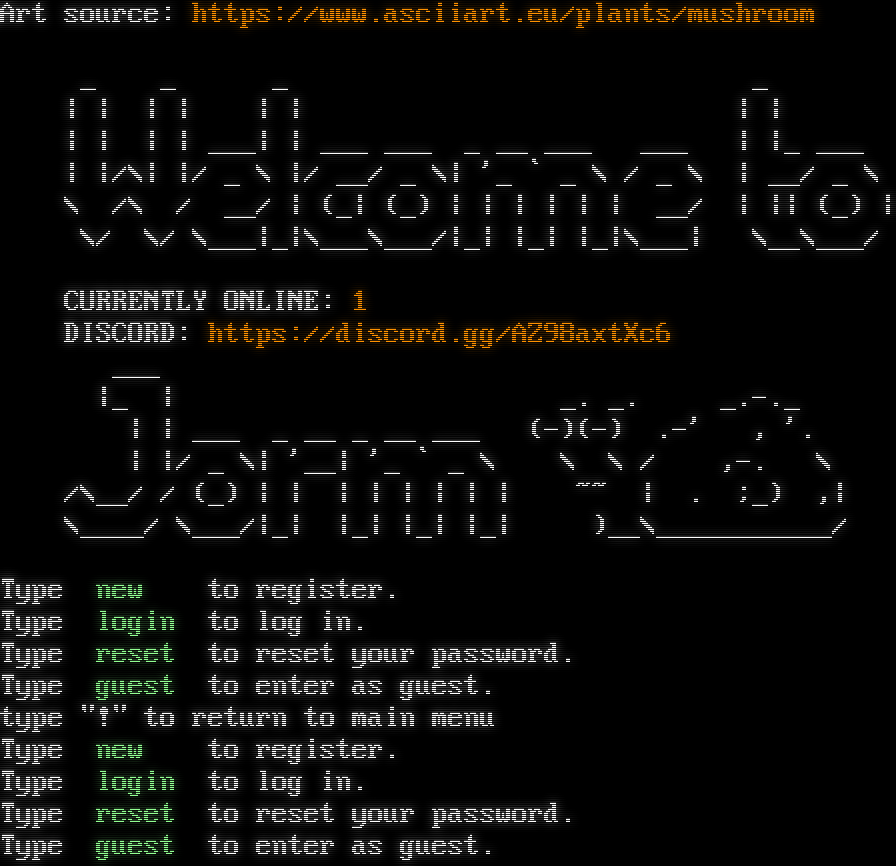 Art source: https://www.asciiart.eu/plants/mushroom _ _ _ _ \| \| \| \| \| \| \| \| \| \| \| \| ___\| \| ___ ___ _ __ ___ ___ \| \|_ ___ \| \|/\\\| \|/ _ \\ \|/ __/ _ \\\| '_ \` _ \\ / _ \\ \| __/ _ \\ \\ /\\ / __/ \| (_\| (_) \| \| \| \| \| \| __/ \| \|\| (_) \| \\/ \\/ \\___\|_\|\\___\\___/\|_\| \|_\| \|_\|\\___\| \\__\\___/ CURRENTLY ONLINE: 1 DISCORD: https://discord.gg/AZ98axtXc6 ___ \|_ \| _. _. _​.-._ \| \| ___ _ __ _ __ ___ (-)(-) .-' , '. \| \|/ _ \\\| '__\| '_ \` _ \\ \\ \\ / ,-. \\ /\\__/ / (_) \| \| \| \| \| \| \| \| ~~ \| . ;_) ,\| \\_​___/ \\___/\|_\| \|_\| \|_\| \|_\| )__\\_​__________/ Type new to register. Type login to log in. Type reset to reset your password. Type guest to enter as guest. type "!" to return to main menu Type new to register. Type login to log in. Type reset to reset your password. Type guest to enter as guest.