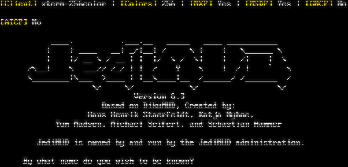 Attempting to Detect Client, Please Wait... [Client] xterm-256color \| [Colors] 256 \| [MXP] Yes \| [MSDP] Yes \| [GMCP] No [ATCP] No _​___. .​___.__ _​____ _​___ _​__________ \| \| _​___ __\| _/\|__\| / \\ \| \| \\_​_____ \\ \| \|/ __ \\ / __ \| \| \|/ \\ / \\\| \| /\| \| \\ /\\__\| \\ ___// /_/ \| \| / Y \\ \| / \| \` \\ \\_​_______\|\\___ >_​___ \| \|__\\_​___\|__ /_​_____/ /_​______ / \\/ \\/ \\/ \\/ Version 6.3 Based on DikuMUD, Created by: Hans Henrik Staerfeldt, Katja Nyboe, Tom Madsen, Michael Seifert, and Sebastian Hammer JediMUD is owned by and run by the JediMUD administration. By what name do you wish to be known?