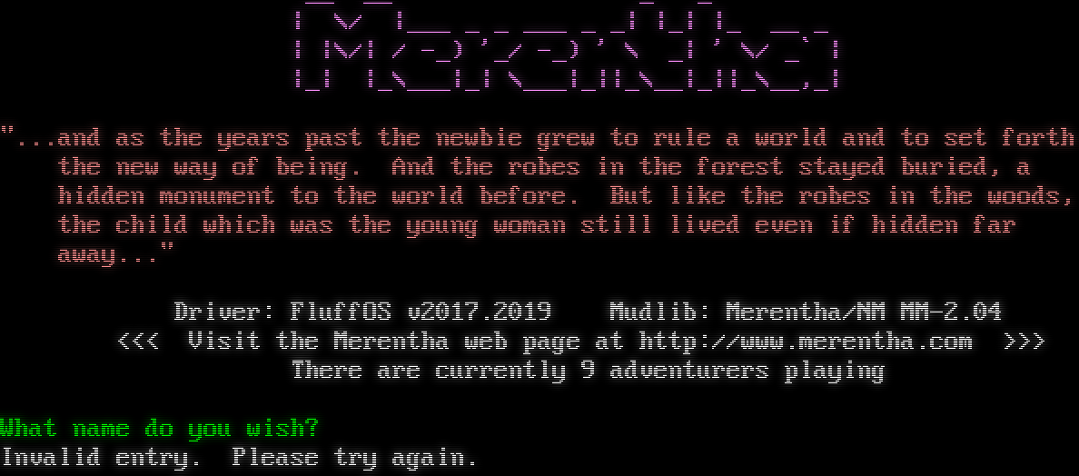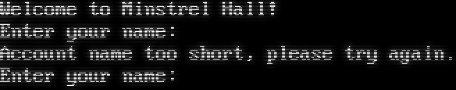 Welcome to Minstrel Hall! Enter your name: Account name too short, please try again. Enter your name: