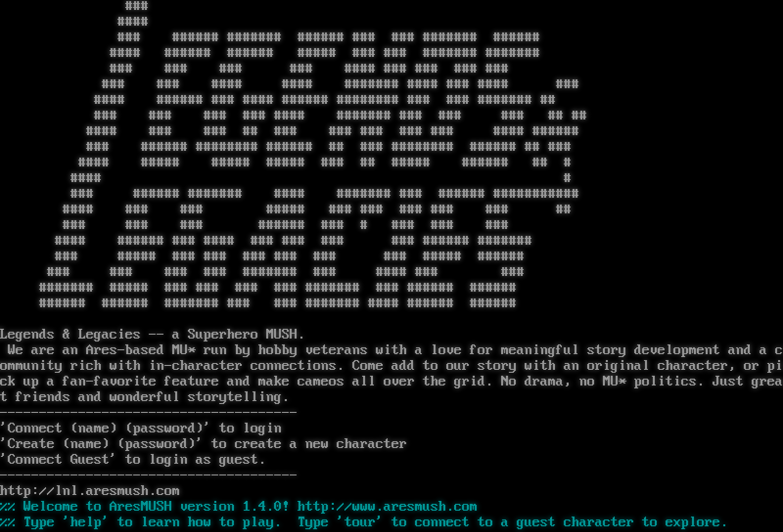 ### #​### ### #​##### #​###### #​##### ### ### #​###### #​##### #​### #​##### #​##### #​#### ### ### #​###### #​###### ### ### ### ### #​### ### ### ### ### ### ### #​### #​### #​###### #​### ### #​### ### #​### #​##### ### #​### #​##### #​####### ### ### #​###### ## ### ### ### ### #​### #​###### ### ### ### ## ## #​### ### ### ## ### ### ### ### ### #​### #​##### ### #​##### #​####### #​##### ## ### #​####### #​##### ## ### #​### #​#### #​#### #​#### ### ## #​#### #​##### ## # #​### # ### #​##### #​###### #​### #​###### ### #​##### #​########## #​### ### ### #​#### ### ### ### ### ### ## ### ### ### #​##### ### # ### ### ### #​### #​##### ### #​### ### ### ### ### #​##### #​###### ### #​#### ### ### ### ### ### ### #​#### #​##### ### ### ### ### #​###### ### #​### ### ### #​###### #​#### ### ### ### ### #​###### ### #​##### #​##### #​##### #​##### #​###### ### ### #​###### #​### #​##### #​##### Legends & Legacies -- a Superhero MUSH. We are an Ares-based MU\* run by hobby veterans with a love for meaningful story development and a community rich with in-character connections. Come add to our story with an original character, or pick up a fan-favorite feature and make cameos all over the grid. No drama, no MU\* politics. Just great friends and wonderful storytelling. -​------------------------------------- 'Connect (name) (password)' to login 'Create (name) (password)' to create a new character 'Connect Guest' to login as guest. -​------------------------------------- http://lnl.aresmush.com %% Welcome to AresMUSH version 1.4.0! http://www.aresmush.com %% Type 'help' to learn how to play. Type 'tour' to connect to a guest character to explore.