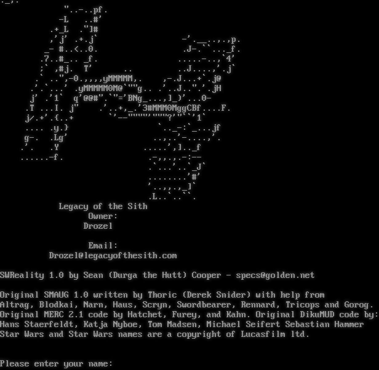 ._,. "​..-..pf. -L ..#' .+_L ."]# ,'j' .+.j\` -'.​__..,.,p. _- #..<..0. .J-.\`\`.​.._f. .7.​.#_.. _f. .​....-..,\`4' ;\` ,#j. T' .. ..J.​...,'.j\` .\` ..",-0.,,,,yMMMMM,. ,-.J.​..+\`.j@ .'.\`...' .yMMMMM0M@\`""g.. .'..J.​.".'.jH j' .'1\` q'@@#".\`"='BNg_​...,]_)'...0- .T ...I. j" .'..+,_.'3#MMM0MggCBf.​...F. j/.+'.{..+ \`'-​-""""'"""?'"\`\`'1\` .​... .y.} \`.​._-:\`_​...jf g-. .Lg' ..,..'-​....,'. .'. .Y .​....',].._f .​.....-f. .-,,.,.-:-- .\`...'..\`_J\` .​.......'#' '..,,.,_]\` .L..\`..\`\`. Legacy of the Sith Owner: Drozel Email: Drozel@legacyofthesith.com SWReality 1.0 by Sean (Durga the Hutt) Cooper - specs@golden.net Original SMAUG 1.0 written by Thoric (Derek Snider) with help from Altrag, Blodkai, Narn, Haus, Scryn, Swordbearer, Rennard, Tricops and Gorog. Original MERC 2.1 code by Hatchet, Furey, and Kahn. Original DikuMUD code by: Hans Staerfeldt, Katja Nyboe, Tom Madsen, Michael Seifert Sebastian Hammer Star Wars and Star Wars names are a copyright of Lucasfilm ltd. Please enter your name: