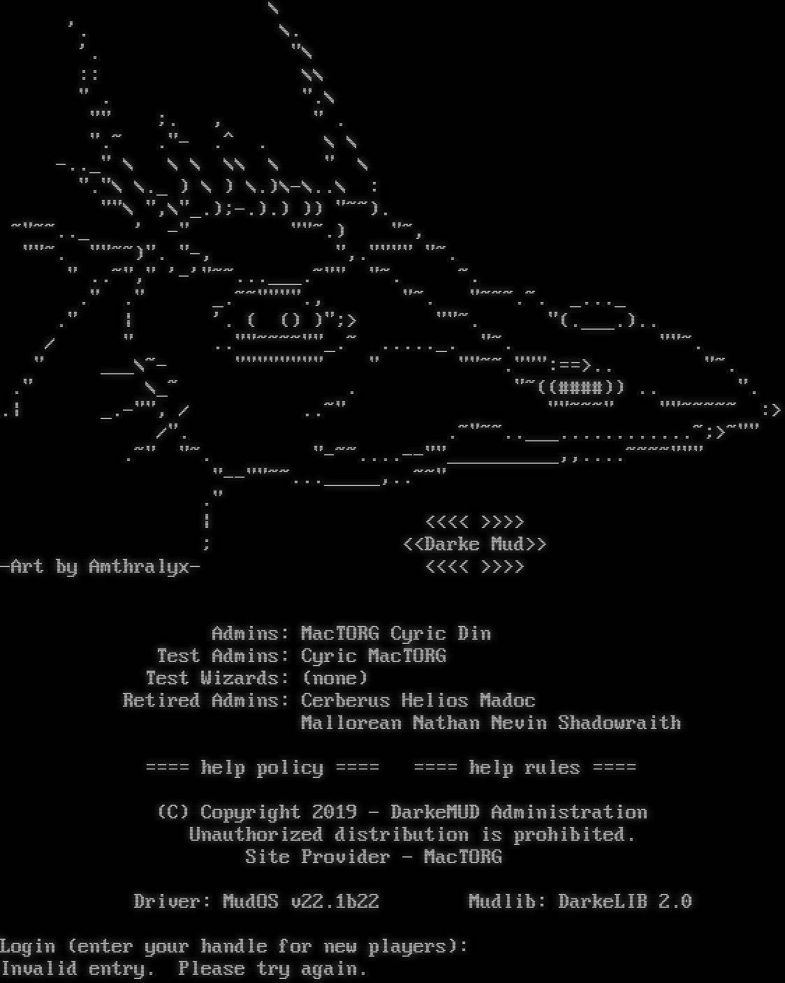 \\ '. \\. '. "\\ :: \\\\ " . ".\\ "" ;. , " . ".~ ."- .^ . \\ \\ -​.._" \\ \\ \\ \\\\ \\ " \\ "."\\ \\._ ) \\ ) \\.)\\-\\..\\ : ""\\ ",\\"_.);-.).) )) "~~). ~​"~~.._ ' -" "​"~.) "~, "​"~. "​"~~)". "-, ",.​"""" "~. " .​.~"," '-'"​~~...___.~"" "~. ~. ." ." _​.~~""""., "~. "​~~~.~. _​..._ ." \| '. ( () )";> "​"~. "(.​___.).. / " .​.""~~~~""_.~ .​...._. "~. "​"~. " ___\\~- "​""""""" " "​"~~.""":==>.. "~. ." \\_~ . "~((#​###)) .. ". .\| _​.-"", / .​.~" "​"~~~" "​"~~~~~ :> /". .​~"~~..___............~;>~"" .~" "~. "​-~~....--""__________,,.​...~~~~""" "​--""~~..._____,.​.~~" ." \| <<<< >>>> ; <<Darke Mud>> -Art by Amthralyx- <<<< >>>> Admins: MacTORG Cyric Din Test Admins: Cyric MacTORG Test Wizards: (none) Retired Admins: Cerberus Helios Madoc Mallorean Nathan Nevin Shadowraith =​=== help policy =​=== =​=== help rules =​=== (C) Copyright 2019 - DarkeMUD Administration Unauthorized distribution is prohibited. Site Provider - MacTORG Driver: MudOS v22.1b22 Mudlib: DarkeLIB 2.0 Login (enter your handle for new players): Invalid entry. Please try again.