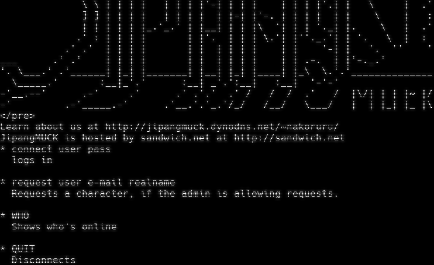 This world is Pueblo 1.0 Enhanced. </xch_mudtext><img xch_mode=html><body bgcolor=#000000 fgcolor=#ffffff text=#ffffff> <HTML><PRE><TT> '-. '. \\ \| /'-​--------'\\ .​--..------.-..------. .​--. .​--..------. \\ \| .' /.​----------. \\ \| \| \| .​---. \|'\| .​--. \| \| \| \| \| \| .​--. \| \\ \| : \\ \\ \| \| \| \| \| \| \| \|'-\| \| \| \| \| \| \| \|'.\| \| \\ \| .' ] ] \| \| \| \| \| \| \| \| \| \|-\| \|'-. \| \| \| \| \| \| \\ \| : \| \| \| \| \| \|_.'_.' \| \|__\| \| \| \|\\ '\| \| \| '._\| \|. \\ \| .' .' : \| \| \| \| \| \|'. \| \| \| \\.'\| \|''._.'\| \| '. \\ \| : .' .' \| \| \| \| \| \| \| \| \| \| \| \| '-\| \| '. '' ' ___ .' .' \| \| \| \| \| \| \| \| \| \| \| \| .-. \| \|'-​._.' '. \\_​__.' .'_​_____\| \|_\| \|_​______\| \|__\| \|_\| \|_​___\| \|_\\ \\.'.'_​_____________ \\_​____.' :__\|_'.' :__\| _'.':__\| :__\| '-'-' -'_​_.--' .-' .' .' .'.' .' / / / .' / \|\\/\| \| \| \|~ \|/ -' .-'_​____.-' .'__.'.'_.'/_/ /__/ \\___/ \| \| \|_\| \|_ \|\\ </pre> Learn about us at http://jipangmuck.dynodns.net/~nakoruru/ JipangMUCK is hosted by sandwich.net at http://sandwich.net \* connect user pass logs in \* request user e-mail realname Requests a character, if the admin is allowing requests. \* WHO Shows who's online \* QUIT Disconnects