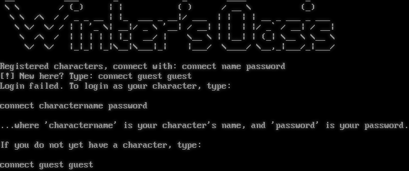__ ___ _ _ _​___ _ \\ \\ / (_) \| \| ( ) / __ \\ (_) \\ \\ /\\ / / _ _ __ \| \|_ ___ _ __\|/ ___ \| \| \| \| __ _ ___ _ ___ \\ \\/ \\/ / \| \| '_ \\\| __\|/ _ \\ '__\| / __\| \| \| \| \|/ _\` / __\| / __\| \\ /\\ / \| \| \| \| \| \|_\| __/ \| \\__ \\ \| \|__\| \| (_\| \\__ \\ \\__ \\ \\/ \\/ \|_\|_\| \|_\|\\__\|\\___\|_\| \|___/ \\_​___/ \\__,_\|___/_\|___/ Registered characters, connect with: connect name password [!] New here? Type: connect guest guest Login failed. To login as your character, type: connect charactername password ...where 'charactername' is your character's name, and 'password' is your password. If you do not yet have a character, type: connect guest guest