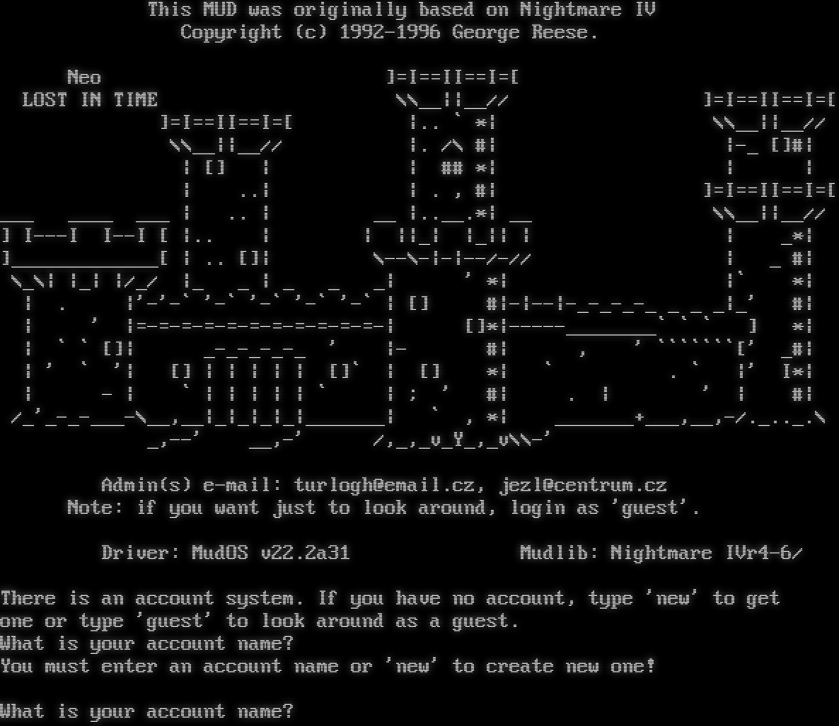 This MUD was originally based on Nightmare IV Copyright (c) 1992-1996 George Reese. Neo ]=I==II==I=[ LOST IN TIME \\\\__\|\|__// ]=I==II==I=[ ]=I==II==I=[ \|.. \` \*\| \\\\__\|\|__// \\\\__\|\|__// \|. /\\ #\| \|-_ []#\| \| [] \| \| ## \*\| \| \| \| ..\| \| . , #\| ]=I==II==I=[ ___ _​___ ___ \| .. \| __ \|.​.__.\*\| __ \\\\__\|\|__// ] I---I I--I [ \|.. \| \| \|\|_\| \|_\|\| \| \| _\*\| ]_​____________[ \| .. []\| \\--\\-\|-\|--/-// \| _ #\| \\_\\\| \|_\| \|/_/ \|_ _ \| _ _ _\| ' \*\| \|\` \*\| \| . \|'-'-\` '-\` '-\` '-\` '-\` \| [] #\|-\|--\|-​_-_-_-_ _ _ _\|_' #\| \| ' \|=​-=-=-=-=-=-=-=-=-=-=-\| []\*\|-​----________\` \` \` ] \*\| \| \` \` []\| _​-_-_-_-_ ' \|- #\| , ' \`\`\`\`\`\`\`[' _#\| \| ' \` '\| [] \| \| \| \| \| []\` \| [] \*\| \` . \` \|' I\*\| \| - \| \` \| \| \| \| \| \` \| ; ' #\| . \| ' \| #\| /_'_​-_-___-\\__,__\|_\|_\|_\|_\|_​______\| \` , \*\| _​______+___,__,-/.​_.._.\\ _,--' __,-' /,_,_v_Y_,_v\\\\-' Admin(s) e-mail: turlogh@email.cz, jezl@centrum.cz Note: if you want just to look around, login as 'guest'. Driver: MudOS v22.2a31 Mudlib: Nightmare IVr4-6/ There is an account system. If you have no account, type 'new' to get one or type 'guest' to look around as a guest. What is your account name? You must enter an account name or 'new' to create new one! What is your account name?
