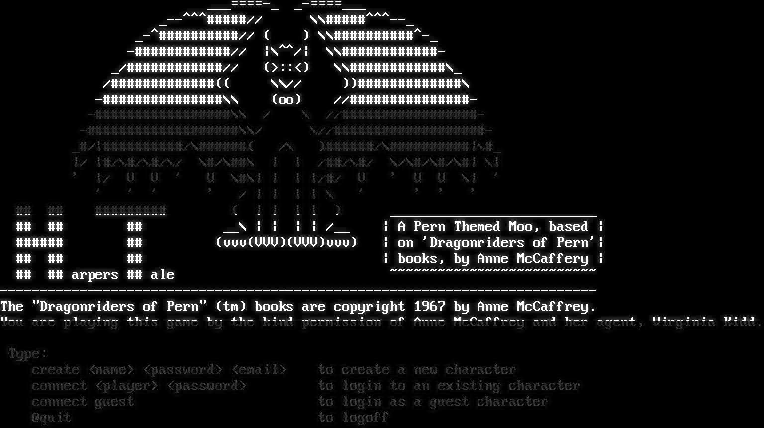 _​__====-_ _​-====___ _​--^^^#####// \\\\#​####^^^--_ _​-^##########// ( ) \\\\#​#########^-_ -​############// \|\\^^/\| \\\\#​###########- _/#​###########// (>::<) \\\\#​###########\\_ /#​############(( \\\\// ))#​############\\ -​###############\\\\ (oo) //#​##############- -​#################\\\\ / \\ //#​################- -​###################\\\\/ \\//#​##################- _#/\|#​#########/\\#​#####( /\\ )#​#####/\\#​#########\|\\#_ \|/ \|#/\\#/\\#/\\/ \\#/\\##\\ \| \| /##/\\#/ \\/\\#/\\#/\\#\| \\\| ' \|/ V V ' V \\#\\\| \| \| \|/#/ V ' V V \\\| ' ' ' ' ' / \| \| \| \| \\ ' ' ' ' ## ## #​######## ( \| \| \| \| ) _​_________________________ ## ## ## __\\ \| \| \| \| /__ \| A Pern Themed Moo, based \| #​##### ## (vvv(VVV)(VVV)vvv) \| on 'Dragonriders of Pern'\| ## ## ## \| books, by Anne McCaffery \| ## ## arpers ## ale ~​~~~~~~~~~~~~~~~~~~~~~~~~~ -​-------------------------------------------------------------------------- The "Dragonriders of Pern" (tm) books are copyright 1967 by Anne McCaffrey. You are playing this game by the kind permission of Anne McCaffrey and her agent, Virginia Kidd. Type: create <name> <password> <email> to create a new character connect <player> <password> to login to an existing character connect guest to login as a guest character @quit to logoff