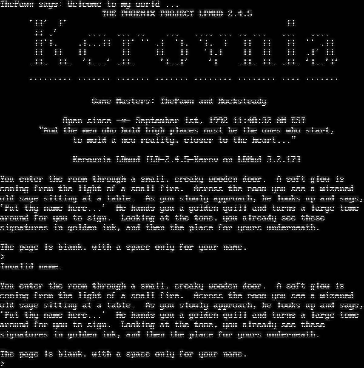ThePawn says: Welcome to my world ... THE PHOENIX PROJECT LPMUD 2.4.5 '\|\|' \|' \|\| \|\| .' .​... ... .. ... .​... ... .. ... ... .​... \|\|'\|. .\|...\|\| \|\|' '' .\| '\|. '\|. \| \|\| \|\| \|\| '' .\|\| \|\| \|\| \|\| \|\| \|\| \|\| '\|.\| \|\| \|\| \|\| .\|' \|\| .\|\|. \|\|. '\|...' .\|\|. '\|..\|' '\| .\|\|. \|\|. .\|\|. '\|..'\|' ''''''''' ''''''' ''''''' ''''''' '''''''' '''''''' '''' ''''''' Game Masters: ThePawn and Rocksteady Open since -\*- September 1st, 1992 11:48:32 AM EST "And the men who hold high places must be the ones who start, to mold a new reality, closer to the heart.​.." Kerovnia LDmud [LD-2.4.5-Kerov on LDMud 3.2.17] You enter the room through a small, creaky wooden door. A soft glow is coming from the light of a small fire. Across the room you see a wizened old sage sitting at a table. As you slowly approach, he looks up and says, 'Put thy name here...' He hands you a golden quill and turns a large tome around for you to sign. Looking at the tome, you already see these signatures in golden ink, and then the place for yours underneath. The page is blank, with a space only for your name. > Invalid name. You enter the room through a small, creaky wooden door. A soft glow is coming from the light of a small fire. Across the room you see a wizened old sage sitting at a table. As you slowly approach, he looks up and says, 'Put thy name here...' He hands you a golden quill and turns a large tome around for you to sign. Looking at the tome, you already see these signatures in golden ink, and then the place for yours underneath. The page is blank, with a space only for your name. >