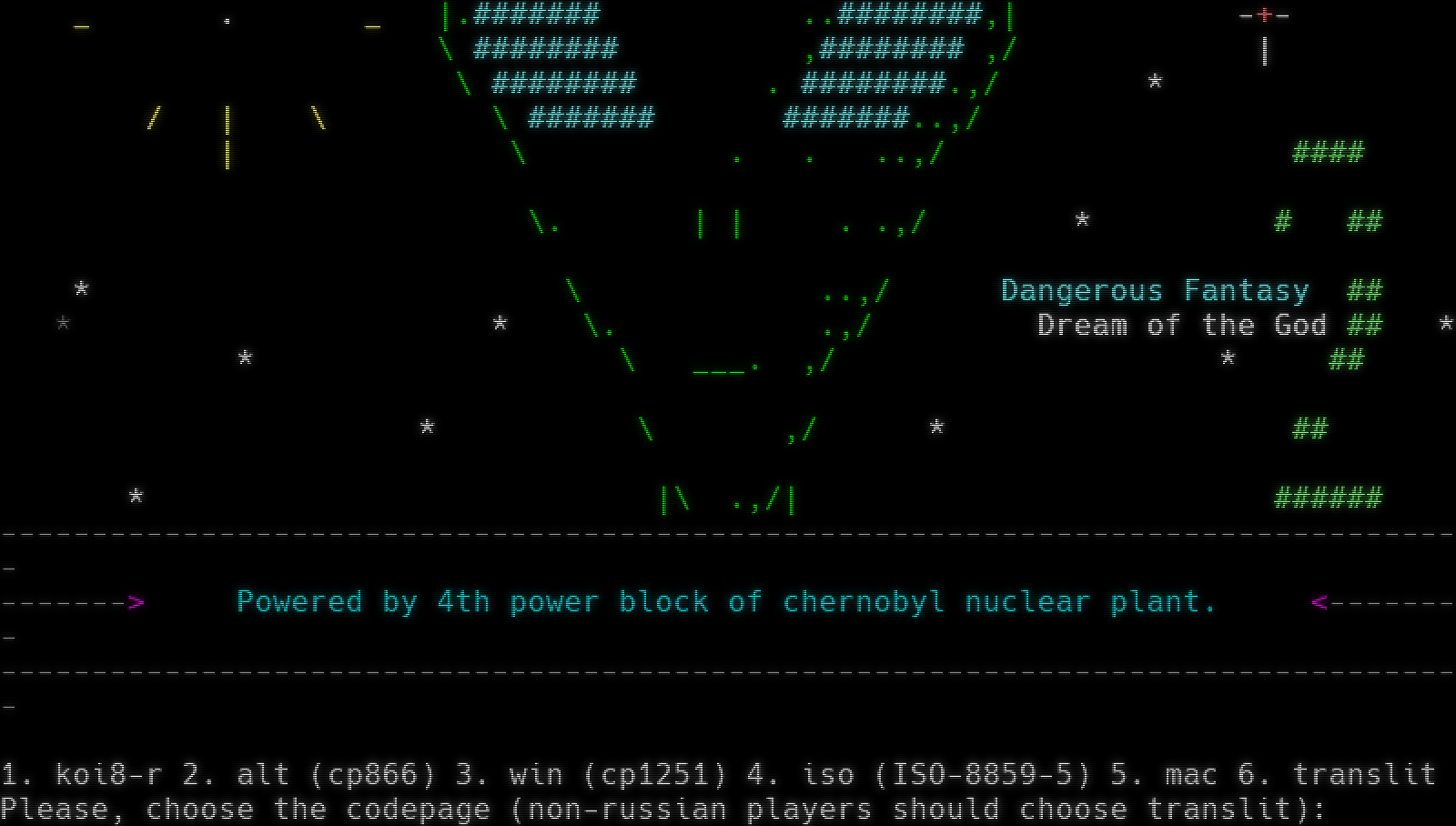 -​-------------------------------------------------------------------------------- -​------> Diku -> Merc -> ROM -> Anatolia -> SoG -> DF -> DF2 <-​------- -​--------------------------------- WWW.DF2.RU -​---------------------------------- -​------> Dangerous Fantasy : Dream of the God, since april 27, 2002 <-​------- -​-------------------------------------------------------------------------------- ./. . ..\\ \|. . . ^. ..\| \* \| \|\| . . . !.\| \* \\ \| / \\( . ,)/ \* \|. #​##### .​#######,,\| \| _ . _ \|.​####### .​.########,\| -+- \\ #​####### ,#​####### ,/ \| \\ #​####### . #​#######.,/ \* / \| \\ \\ #​###### #​######..,/ \| \\ . . ..,/ #​### \\. \| \| . .,/ \* # ## \* \\ ..,/ Dangerous Fantasy ## \* \* \\. .,/ Dream of the God ## \* \* \\ _​__. ,/ \* ## \* \\ ,/ \* ## \* \|\\ .,/\| #​##### -​-------------------------------------------------------------------------------- -​------> Powered by 4th power block of chernobyl nuclear plant. <-​------- -​-------------------------------------------------------------------------------- 1. koi8-r 2. alt (cp866) 3. win (cp1251) 4. iso (ISO-8859-5) 5. mac 6. translit Please, choose the codepage (non-russian players should choose translit):