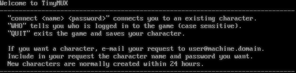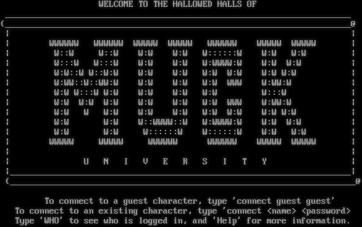 WELCOME TO THE HALLOWED HALLS OF _​_____________________________________________________________________ (_​_____________________________________________________________________@ \| \| \| WWWWWW WWWWWW WWWWW WWWWW WWWWWW WWWWW WWWWW \| \| W::W W::W W:W W:W W::::::W W:W W:W \| \| W:::W W:::W W:W W:W W:WWWW:W W:W W:W \| \| W:W::W W::W:W W:W W:W W:W W:W W:W W:W \| \| W:WW::W::WW:W W:W W:W W:W WWW W:WW:W \| \| W:W W:::W W:W W:W W:W W:W W:::W \| \| W:W W:W W:W W:W W:W W:W WWW W:WW:W \| \| W:W W W:W W:W W:W W:W W:W W:W W:W \| \| W:W W:W W::WWWW::W W:WWWW:W W:W W:W \| \| W:W W:W W::::::W W::::::W W:W W:W \| \| WWWWW WWWWW WWWWWW WWWWWW WWWWW WWWWW \| \| \| \| U N I V E R S I T Y \| \|_​____________________________________________________________________\| (_​_____________________________________________________________________@ To connect to a guest character, type 'connect guest guest' To connect to an existing character, type 'connect <name> <password> Type 'WHO' to see who is logged in, and 'Help' for more information.
