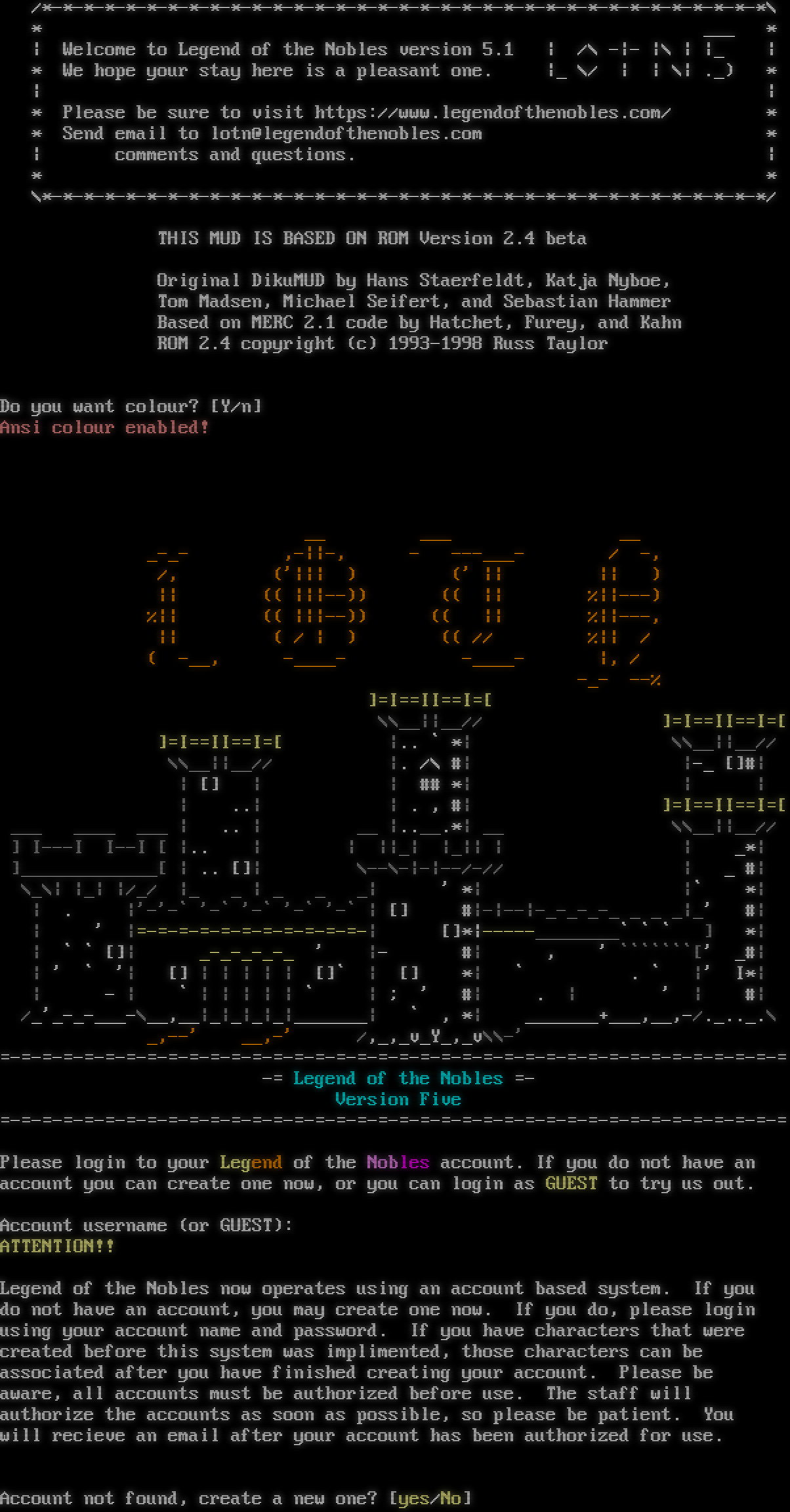 /\*-\*-\*-\*-\*-\*-\*-\*-\*-\*-\*-\*-\*-\*-\*-\*-\*-\*-\*-\*-\*-\*-\*-\*-\*-\*-\*-\*-\*-\*-\*-\*-\*-\*-\*\\ \* ___ \* \| Welcome to Legend of the Nobles version 5.1 \| /\\ -\|- \|\\ \| \|_ \| \* We hope your stay here is a pleasant one. \|_ \\/ \| \| \\\| ._) \* \| \| \* Please be sure to visit https://www.legendofthenobles.com/ \* \* Send email to lotn@legendofthenobles.com \* \| comments and questions. \| \* \* \\\*-\*-\*-\*-\*-\*-\*-\*-\*-\*-\*-\*-\*-\*-\*-\*-\*-\*-\*-\*-\*-\*-\*-\*-\*-\*-\*-\*-\*-\*-\*-\*-\*-\*-\*/ THIS MUD IS BASED ON ROM Version 2.4 beta Original DikuMUD by Hans Staerfeldt, Katja Nyboe, Tom Madsen, Michael Seifert, and Sebastian Hammer Based on MERC 2.1 code by Hatchet, Furey, and Kahn ROM 2.4 copyright (c) 1993-1998 Russ Taylor Do you want colour? [Y/n] Ansi colour enabled! __ ___ __ _​-_- ,-\|\|-, - -​--___- / -, /, ('\|\|\| ) (' \|\| \|\| ) \|\| (( \|\|\|--)) (( \|\| %\|\|---) %\|\| (( \|\|\|--)) (( \|\| %\|\|---, \|\| ( / \| ) (( // %\|\| / ( -__, -​____- -​____- \|, / -_- --% ]=I==II==I=[ \\\\__\|\|__// ]=I==II==I=[ ]=I==II==I=[ \|.. \` \*\| \\\\__\|\|__// \\\\__\|\|__// \|. /\\ #\| \|-_ []#\| \| [] \| \| ## \*\| \| \| \| ..\| \| . , #\| ]=I==II==I=[ ___ _​___ ___ \| .. \| __ \|.​.__.\*\| __ \\\\__\|\|__// ] I---I I--I [ \|.. \| \| \|\|_\| \|_\|\| \| \| _\*\| ]_​____________[ \| .. []\| \\--\\-\|-\|--/-// \| _ #\| \\_\\\| \|_\| \|/_/ \|_ _ \| _ _ _\| ' \*\| \|\` \*\| \| . \|'-'-\` '-\` '-\` '-\` '-\` \| [] #\|-\|--\|-​_-_-_-_ _ _ _\|_' #\| \| ' \|=​-=-=-=-=-=-=-=-=-=-=-\| []\*\|-​----________\` \` \` ] \*\| \| \` \` []\| _​-_-_-_-_ ' \|- #\| , ' \`\`\`\`\`\`\`[' _#\| \| ' \` '\| [] \| \| \| \| \| []\` \| [] \*\| \` . \` \|' I\*\| \| - \| \` \| \| \| \| \| \` \| ; ' #\| . \| ' \| #\| /_'_​-_-___-\\__,__\|_\|_\|_\|_\|_​______\| \` , \*\| _​______+___,__,-/.​_.._.\\ _,--' __,-' /,_,_v_Y_,_v\\\\-' =​-=-=-=-=-=-=-=-=-=-=-=-=-=-=-=-=-=-=-=-=-=-=-=-=-=-=-=-=-=-=-=-=-=-=-=-=-= -= Legend of the Nobles =- Version Five =​-=-=-=-=-=-=-=-=-=-=-=-=-=-=-=-=-=-=-=-=-=-=-=-=-=-=-=-=-=-=-=-=-=-=-=-=-= Please login to your Legend of the Nobles account. If you do not have an account you can create one now, or you can login as GUEST to try us out. Account username (or GUEST): ATTENTION!! Legend of the Nobles now operates using an account based system. If you do not have an account, you may create one now. If you do, please login using your account name and password. If you have characters that were created before this system was implimented, those characters can be associated after you have finished creating your account. Please be aware, all accounts must be authorized before use. The staff will authorize the accounts as soon as possible, so please be patient. You will recieve an email after your account has been authorized for use. Account not found, create a new one? [yes/No]