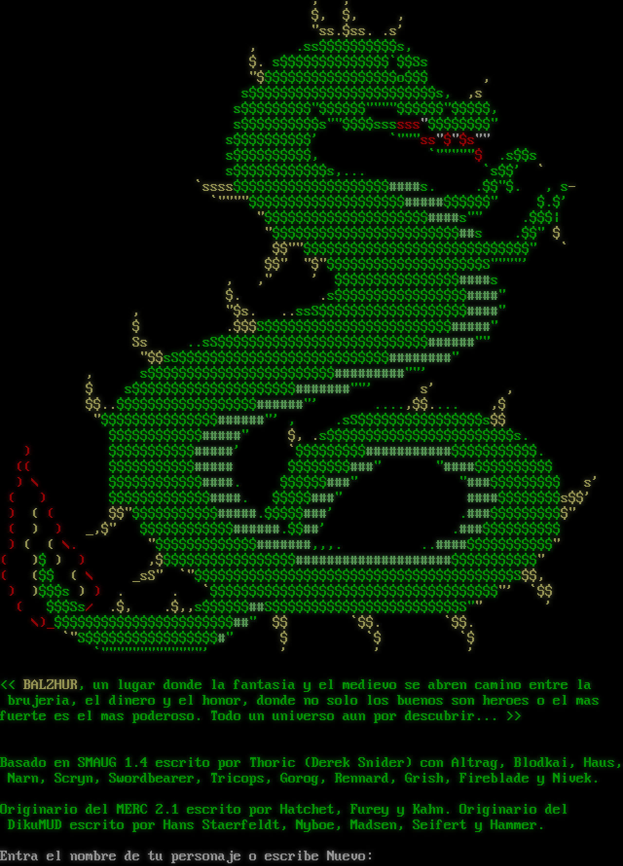 . , , $, $, , "ss.$ss. .s' , .ss$$$$$$$$$$s, $. s$$$$$$$$$$$$$$\`$$Ss "$$$$$$$$$$$$$$$$$$o$$$ , s$$$$$$$$$$$$$$$$$$$$$$$$s, ,s s$$$$$$$$$"$$$$$$"​"""$$$$$$"$$$$$, s$$$$$$$$$$s""$$$$ssssss"$$$$$$$$" s$$$$$$$$$$' \`"""ss"$"$s"" s$$$$$$$$$$, \`"​""""$ .s$$s s$$$$$$$$$$$$s,... \`s$$' \` \`ssss$$$$$$$$$$$$$$$$$$$$#​###s. .$$"$. , s- \`"​"""$$$$$$$$$$$$$$$$$$$$#​####$$$$$$" $.$' "$$$$$$$$$$$$$$$$$$$$$#​###s"" .$$$\| "$$$$$$$$$$$$$$$$$$$$$$$$##s .$$" $ $$""$$$$$$$$$$$$$$$$$$$$$$$$$$$$$" \` $$" "$"$$$$$$$$$$$$$$$$$$$$S"​"""' , ," ' $$$$$$$$$$$$$$$$#​###s $. .s$$$$$$$$$$$$$$$$$#​###" , "$s. ..ssS$$$$$$$$$$$$$$$$$$$#​###" $ .$$$S$$$$$$$$$$$$$$$$$$$$$$$$#​####" Ss ..sS$$$$$$$$$$$$$$$$$$$$$$$$$$$#​#####"" "$$sS$$$$$$$$$$$$$$$$$$$$$$$$$$$#​#######" , s$$$$$$$$$$$$$$$$$$$$$$$$#​########""' $ s$$$$$$$$$$$$$$$$$$$$$#​######""' s' , $$..$$$$$$$$$$$$$$$$$$#​#####"' .​...,$$.​... ,$ "$$$$$$$$$$$$$$$#​#####"' , .sS$$$$$$$$$$$$$$$$s$$ $$$$$$$$$$$$#​####" $, .s$$$$$$$$$$$$$$$$$$$$$$$$s. ) $$$$$$$$$$$#​####' \`$$$$$$$$$#​##########$$$$$$$$$$$. (( $$$$$$$$$$$#​#### $$$$$$$$#​##" "​####$$$$$$$$$$ ) \\ $$$$$$$$$$$$#​###. $$$$$$#​##" "​###$$$$$$$$$ s' ( ) $$$$$$$$$$$$$#​###. $$$$$#​##" #​###$$$$$$$$s$$' ) ( ( $$"$$$$$$$$$$$#​####.$$$$$###' .​###$$$$$$$$$$" ( ) ) _,$" $$$$$$$$$$$$#​#####.$$##' .​###$$$$$$$$$$ ) ( ( \\. "$$$$$$$$$$$$$#​######,,,. .​.####$$$$$$$$$$$" ( )$ ) ) ,$$$$$$$$$$$$$$$$$$#​###################$$$$$$$$$$$" ( ($$ ( \\ _sS" \`"$$$$$$$$$$$$$$$$$$$$$$$$$$$$$$$$$$$$$$$$$S$$, ) )$$$s ) ) . . \`$$$$$$$$$$$$$$$$$$$$$$$$$$$$$$$$$$$$$"' \`$$ ( $$$Ss/ .$, .$,,s$$$$$$##S$$$$$$$$$$$$$$$$$$$$$$$$S"" ' \\)_$$$$$$$$$$$$$$$$$$$$$$$##" $$ \`$$. \`$$. \`"S$$$$$$$$$$$$$$$$$#" $ \`$ \`$ \`"​""""""""""""' ' ' ' << BALZHUR, un lugar donde la fantasia y el medievo se abren camino entre la brujeria, el dinero y el honor, donde no solo los buenos son heroes o el mas fuerte es el mas poderoso. Todo un universo aun por descubrir... >> Basado en SMAUG 1.4 escrito por Thoric (Derek Snider) con Altrag, Blodkai, Haus, Narn, Scryn, Swordbearer, Tricops, Gorog, Rennard, Grish, Fireblade y Nivek. Originario del MERC 2.1 escrito por Hatchet, Furey y Kahn. Originario del DikuMUD escrito por Hans Staerfeldt, Nyboe, Madsen, Seifert y Hammer. Entra el nombre de tu personaje o escribe Nuevo: