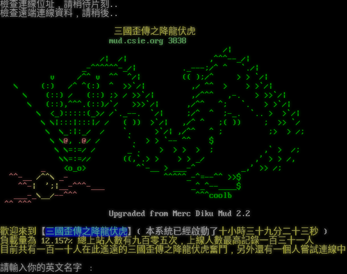 檢查連線位址﹐請稍待片刻... 檢查遠端連線資料﹐請稍後... 三國歪傳之降龍伏虎 mud.csie.org 3838 /\| /\| /\| ,^​^^--_/\| _​-^^^^^^-_/\| .​_---;/^ ^ \`./\| v /^^ v ^^ ^/\| (( );/^ > > \`/\| \\ (:) /^ ^(:) ^ >>\`/\| ,/ ^^ > > >\`/\| \\ (::) / (::) ;> / >>\`/\| ,/^^^ ,-. > >>\`/\| \\ (::),^​^^.(::)/\`/ >>>\`/\| ,/^^ ^; \`. > >\`/\| \\ <_):::::(_>/ /\`.​_--. \`/\| ;/^ ^ ;-_. \`.. > >\`/\| \\ \\\|:::\|:::\|/ / ( )) >\`/\| ,/^ ^ ;( )) ; >> \`/ \\ \\_:\|:_/ / \`. >\`/\| ,/^^ ^ ; ;> > /; \\ \\@, .@/ / \`. > > \`-- ^^ $ \\ \\=:=/ / _\`. > > > > ; ,\` > /; \\\\=:=// ((,\`.> > > > _/ ,' > > /, _ <o_o> ^\`-__ > _​__-^ _,' >> /; ^​^-__ /^^\\ _- ^​^^^^_-^=--^^ >>$ ^^-\| ';\|_​_-^^^-___ _​^_^--____$ _​__-_\\__/-​-^^^ ^^^coolb ^^ ^^^ Upgraded from Merc Diku Mud 2.2 歡迎來到【三國歪傳之降龍伏虎】( 本系統已經啟動了十小時三十九分二十三秒 ) 負載量為 12.157% 總上站人數有九百零五次﹐上線人數最高記錄一百三十一人 目前共有一百一十人在此遙遠的三國歪傳之降龍伏虎奮鬥﹐另外還有一個人嘗試連線中 請輸入你的英文名字 ﹕