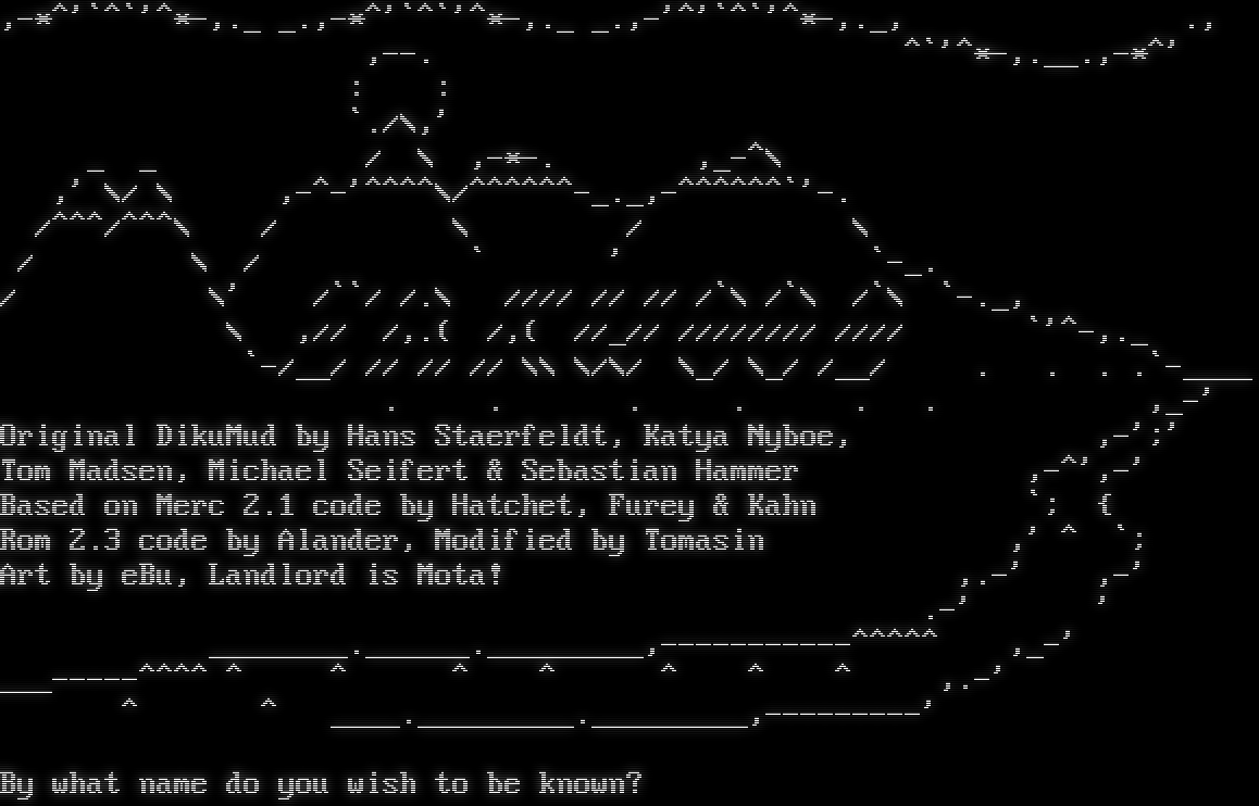 ,-\*^'\`^\`'^\*-,._ _.,-\*^'\`^\`'^\*-,._ _.,-'^'\`^\`'^\*-,._, ., ,--. ^\`'^\*-,.​__.,-\*^' : : \`./\\,' _ _ / \\ ,-\*-. ,_-^\\ ,' \\/ \\ ,-^-'^​^^^\\/^​^^^^^-_._,-​^^^^^^\`'-. /^^^/^^^\\ / \\ / \\ / \\ / \` ' \`-_. / \\' /\`\`/ /.\\ //// // // /\`\\ /\`\\ /\`\\ \`-._, \\ ,// /,.( /,( //_// //////// //// \`'^-,._ \`-/__/ // // // \\\\ \\/\\/ \\_/ \\_/ /__/ . . . .\`-​____ . . . . . . ,_-' Original DikuMud by Hans Staerfeldt, Katya Nyboe, ,-';' Tom Madsen, Michael Seifert & Sebastian Hammer ,-^',-' Based on Merc 2.1 code by Hatchet, Furey & Kahn \`; { Rom 2.3 code by Alander, Modified by Tomasin ,' ^ \`; Art by eBu, Landlord is Mota! ,.-' ,-' .-' ' _​_______.______._________,-​----------^^^^^ ,_-' _​__-----^^^^ ^ ^ ^ ^ ^ ^ ^ ,.-' ^ ^ _​___._________._________,-​--------' By what name do you wish to be known?