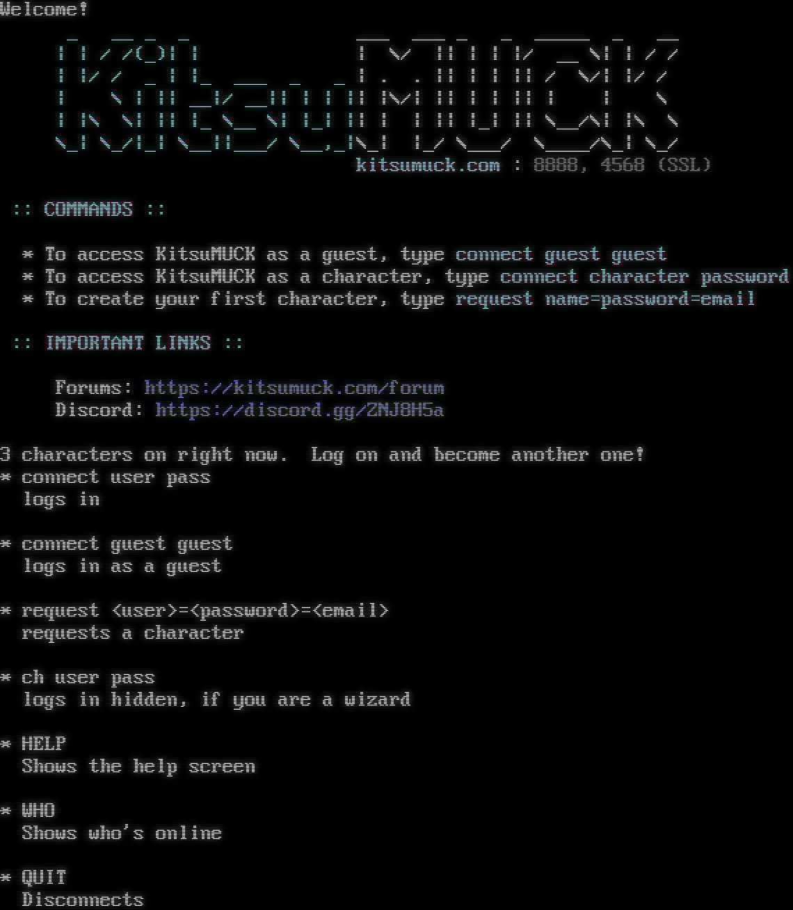 Welcome! _ __ _ _ ___ ___ _ _ _​____ _ __ \| \| / /(_)\| \| \| \\/ \|\| \| \| \|/ __ \\\| \| / / \| \|/ / _ \| \|_ ___ _ _ \| . . \|\| \| \| \|\| / \\/\| \|/ / \| \\ \| \|\| __\|/ __\|\| \| \| \|\| \|\\/\| \|\| \| \| \|\| \| \| \\ \| \|\\ \\\| \|\| \|_ \\__ \\\| \|_\| \|\| \| \| \|\| \|_\| \|\| \\__/\\\| \|\\ \\ \\_\| \\_/\|_\| \\__\|\|___/ \\__,_\|\\_\| \|_/ \\___/ \\_​___/\\_\| \\_/ kitsumuck.com : 8888, 4568 (SSL) :: COMMANDS :: \* To access KitsuMUCK as a guest, type connect guest guest \* To access KitsuMUCK as a character, type connect character password \* To create your first character, type request name=password=email :: IMPORTANT LINKS :: Forums: https://kitsumuck.com/forum Discord: https://discord.gg/ZNJ8H5a 3 characters on right now. Log on and become another one! \* connect user pass logs in \* connect guest guest logs in as a guest \* request <user>=<password>=<email> requests a character \* ch user pass logs in hidden, if you are a wizard \* HELP Shows the help screen \* WHO Shows who's online \* QUIT Disconnects