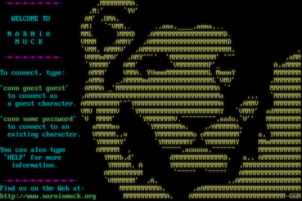 -\*-\*-\*-\*-\*-\*-\*- ,MMMMMMMMA. ,M;' \`YV' WELCOME TO AM' ,OMA, AM\| \`~VMM,. .,ama,_​___,amma,.. N A R N I A MML )MMMD .AMMMMMMMMMMMMMMMMMMD. M U C K VMMM .AMMY' ,AMMMMMMMMMMMMMMMMMMMMD \`VMM, AMMMV' ,AMMMMMMMMMMMMMMMMMMMMMMM, , -\*-\*-\*-\*-\*-\*-\*- VMMMmMMV' ,AMY~~'' 'MMMMMMMMMMMM' '~~ ,aMM \`YMMMM' AMM' \`VMMMMMMMMP'_ A,aMMMM To connect, type: AMMM' VMMA. YVmmmMMMMMMMMMMML MmmmY MMMMMMM ,AMMA _,HMMMMmdMMMMMMMMMMMMMMMML\`VMV' ,MMMMMMM 'conn guest guest' AMMMA _'MMMMMMMMMMMMMMMMMMMMMMMMMMA \`' MMMMMMMM to connect as ,AMMMMMMMMMMMMMMMMMMMMMMMMMMMMMMMMMMa ,,, \`MMMMMMM a guest character. AMMMMMMMMM'~\`YMMMMMMMMMMMMMMMMMMMMMMA ,AMMV MMMMMMM VMV MMMMMV \`YMMMMMMMMMMMMMMMMMMMMMY \`VMMY' adMMMMMMM 'conn name password' \`V MMMM' \`YMMMMMMMV.​~~~~~~~~~,aado,\`V'' MMMMMMMMM to connect to an aMMMMmv \`YMMMMMMMm, ,/AMMMMMA, YMMMMMMMM existing character. VMMMMM,,v YMMMMMMMMMo oMMMMMMMMM' a, YMMMMMMM \`YMMMMMY' \`YMMMMMMMY' \`YMMMMMMMY MMmMMMMMMMM You can also type AMMMMM , ~​~~~~,aooooa,~​~~~~~ MMMMMMMMMMM 'HELP' for more YMMMb,d' dMMMMMMMMMMMMMD, a,, AMMMMMMMMMM information. YMMMMM, A YMMMMMMMMMMMMMY ,MMMMMMMMMMMMMMM AMMMMMMMMM \`~​~~~' \`~​~~~' AMMMMMMMMMMMMMMM -\*-\*-\*-\*-\*-\*-\*-\*-\*- \`VMMMMMM' ,A, ,,AMMMMMMMMMMMMMMMM Find us on the Web at: MMMMMMMMMMA, ,aAMMMMMMMMMMMMMMMMMMMMMMMMM http://www.narniamuck.org MMMMMMMMMMMA, AMMMMMMMMMMMMMMMMMMMMMMMM-GGN