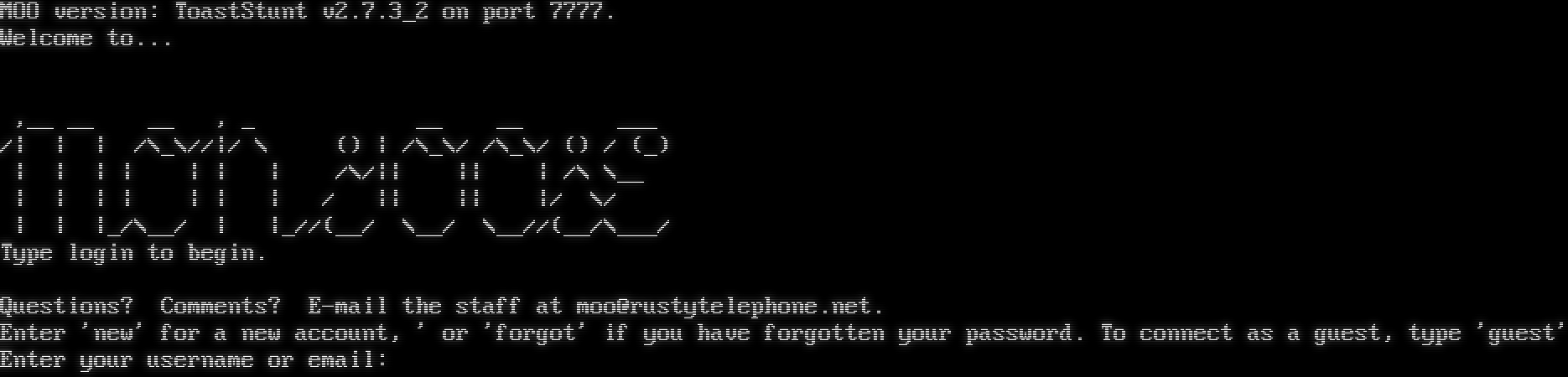 MOO version: ToastStunt v2.7.3_2 on port 7777. Welcome to... ,__ __ __ , _ __ __ ___ /\| \| \| /\\_\\//\|/ \\ () \| /\\_\\/ /\\_\\/ () / (_) \| \| \| \| \| \| \| /\\/\|\| \|\| \| /\\ \\__ \| \| \| \| \| \| \| / \|\| \|\| \|/ \\/ \| \| \|_/\\__/ \| \|_//(__/ \\__/ \\__//(__/\\___/ Type login to begin. Questions? Comments? E-mail the staff at moo@rustytelephone.net. Enter 'new' for a new account, ' or 'forgot' if you have forgotten your password. To connect as a guest, type 'guest' Enter your username or email: