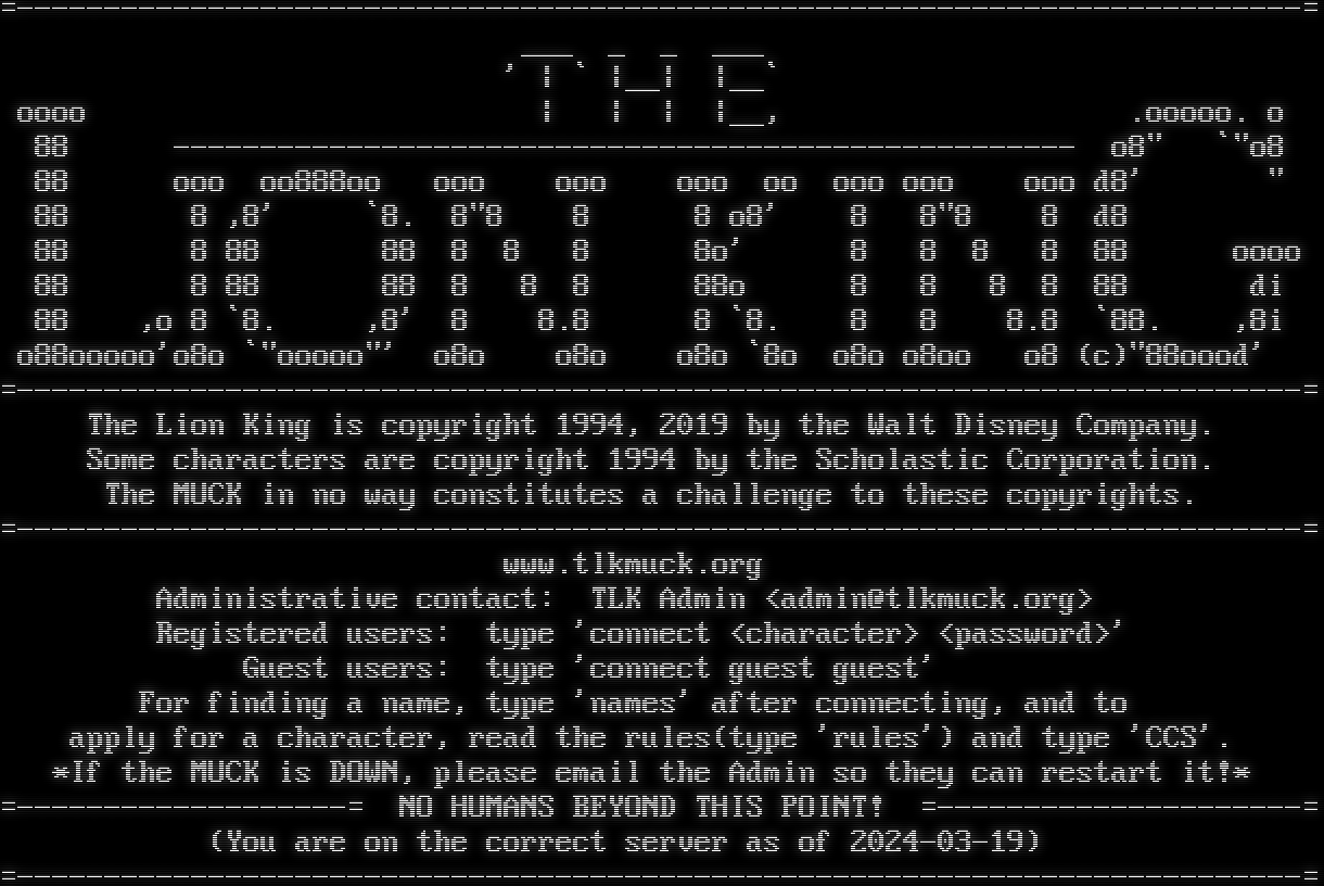 =​--------------------------------------------------------------------------= ___ _ _ ___ ' \| \` \|__\| \|__\` oooo \| \| \| \|__, .ooooo. o 88 -​--------------------------------------------------- o8" \`"o8 88 ooo oo888oo ooo ooo ooo oo ooo ooo ooo d8' " 88 8 ,8' \`8. 8"8 8 8 o8' 8 8"8 8 d8 88 8 88 88 8 8 8 8o' 8 8 8 8 88 oooo 88 8 88 88 8 8 8 88o 8 8 8 8 88 di 88 ,o 8 \`8. ,8' 8 8.8 8 \`8. 8 8 8.8 \`88. ,8i o88ooooo'o8o \`"ooooo"' o8o o8o o8o \`8o o8o o8oo o8 (c)"88oood' =​--------------------------------------------------------------------------= The Lion King is copyright 1994, 2019 by the Walt Disney Company. Some characters are copyright 1994 by the Scholastic Corporation. The MUCK in no way constitutes a challenge to these copyrights. =​--------------------------------------------------------------------------= www.tlkmuck.org Administrative contact: TLK Admin <admin@tlkmuck.org> Registered users: type 'connect <character> <password>' Guest users: type 'connect guest guest' For finding a name, type 'names' after connecting, and to apply for a character, read the rules(type 'rules') and type 'CCS'. \*If the MUCK is DOWN, please email the Admin so they can restart it!\* =​-------------------= NO HUMANS BEYOND THIS POINT! =​---------------------= (You are on the correct server as of 2024-03-19) =​--------------------------------------------------------------------------=