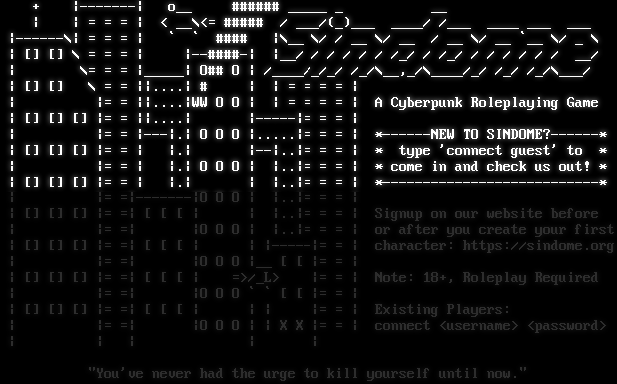 + \|-​------\| o__ #​##### _​____ _ __ \| \| = = = \| < __\\<= #​#### / ___/(_)___ _​___/ /___ _​___ ___ ___ \|-​-----\\\| = = = \| \` \` #​### \|\\__ \\/ / __ \\/ __ / __ \\/ __ \`__ \\/ _ \\ \| [] [] \\ = = = \| \|-​-####-\| \|__/ / / / / / /_/ / /_/ / / / / / / __/ \| \\= = = \|_​____\| O## O \| /_​___/_/_/ /_/\\__,_/\\_​___/_/ /_/ /_/\\___/ \| [] [] \\ = = \|\|.​...\| # \| \| = = = = \| \| \|= = \|\|.​...\|WW O O \| \| = = = = \| A Cyberpunk Roleplaying Game \| [] [] [] \|= = \|\|.​...\| \|-​----\|= = = \| \| \|= = \|---\|.\| O O O \|.​....\|= = = \| \*-​-----NEW TO SINDOME?-​-----\* \| [] [] [] \|= = \| \|.\| \|--\|..\|= = = \| \* type 'connect guest' to \* \| \|= = \| \|.\| O O O \| \|..\|= = = \| \* come in and check us out! \* \| [] [] [] \|= = \| \|.\| \| \|..\|= = = \| \*-​--------------------------\* \| \|= =\|-​------\|O O O \| \|..\|= = = \| \| [] [] [] \|= =\| [ [ [ \| \| \|..\|= = = \| Signup on our website before \| \|= =\| \|O O O \| \|..\|= = = \| or after you create your first \| [] [] [] \|= =\| [ [ [ \| \| \|-​----\|= = \| character: https://sindome.org \| \|= =\| \|O O O \|__ [ [ \|= = \| \| [] [] [] \|= =\| [ [ [ \| =>/_L> \|= = \| Note: 18+, Roleplay Required \| \|= =\| \|O O O \` \` [ [ \|= = \| \| [] [] [] \|= =\| [ [ [ \| \| \| \|= = \| Existing Players: \| \|= =\| \|O O O \| \| X X \|= = \| connect <username> <password> \| \| \| \| \| "You've never had the urge to kill yourself until now."