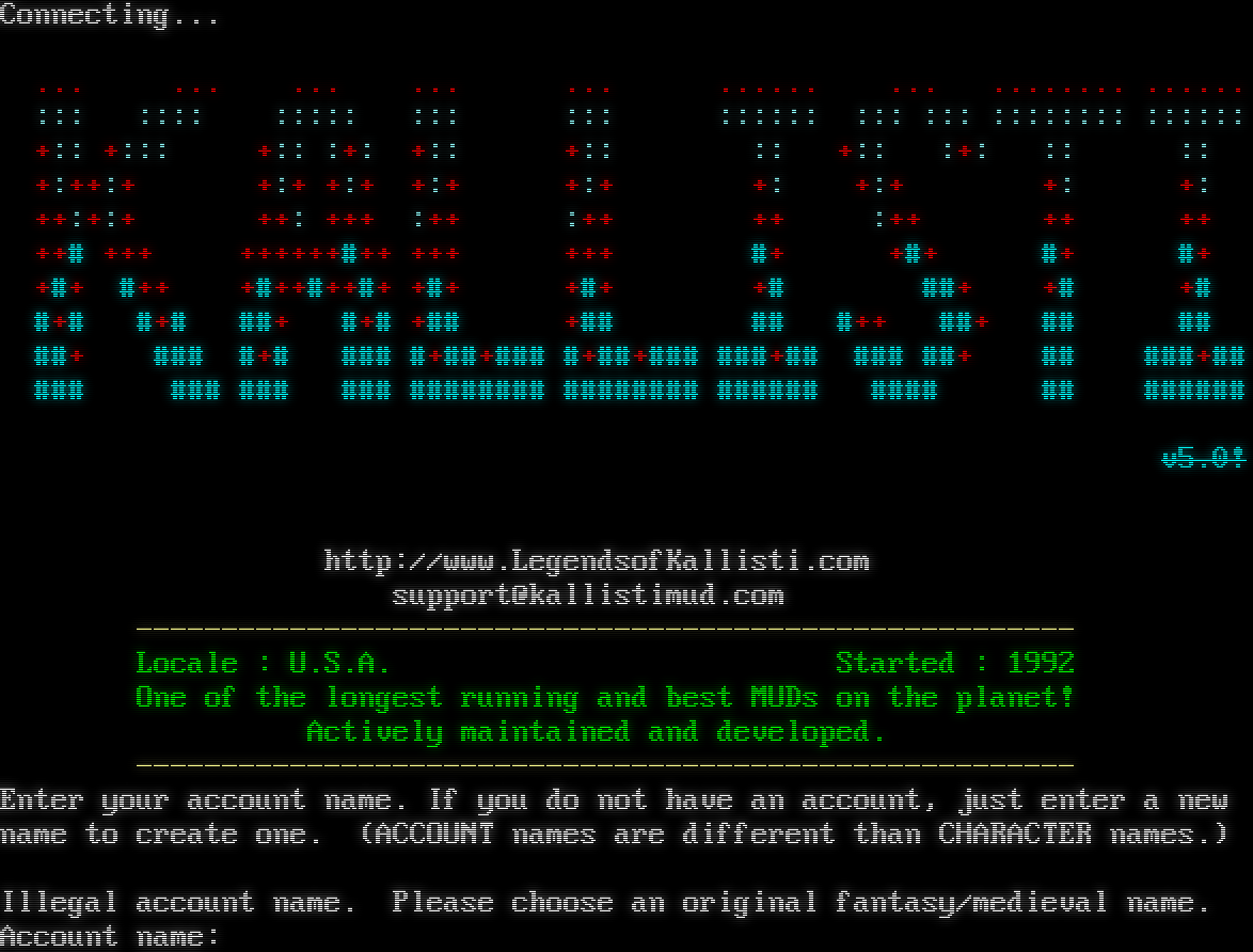 Connecting... ... ... ... ... ... .​..... ... .​....... .​..... ::: :::: ::::: ::: ::: :::::: ::: ::: :::::::: :::::: +:: +::: +:: :+: +:: +:: :: +:: :+: :: :: +:++:+ +:+ +:+ +:+ +:+ +: +:+ +: +: ++:+:+ ++: +++ :++ :++ ++ :++ ++ ++ ++# +++ +​+++++#++ +++ +++ #+ +#+ #+ #+ +#+ #++ +​#++#++#+ +#+ +#+ +# ##+ +# +# #+# #+# ##+ #+# +## +## ## #++ ##+ ## ## ##+ ### #+# ### #​+##+### #​+##+### #​##+## ### ##+ ## #​##+## ### ### ### ### #​####### #​####### #​##### #​### ## #​##### v5.0! http://www.LegendsofKallisti.com support@kallistimud.com -​------------------------------------------------------ Locale : U.S.A. Started : 1992 One of the longest running and best MUDs on the planet! Actively maintained and developed. -​------------------------------------------------------ Enter your account name. If you do not have an account, just enter a new name to create one. (ACCOUNT names are different than CHARACTER names.) Illegal account name. Please choose an original fantasy/medieval name. Account name: