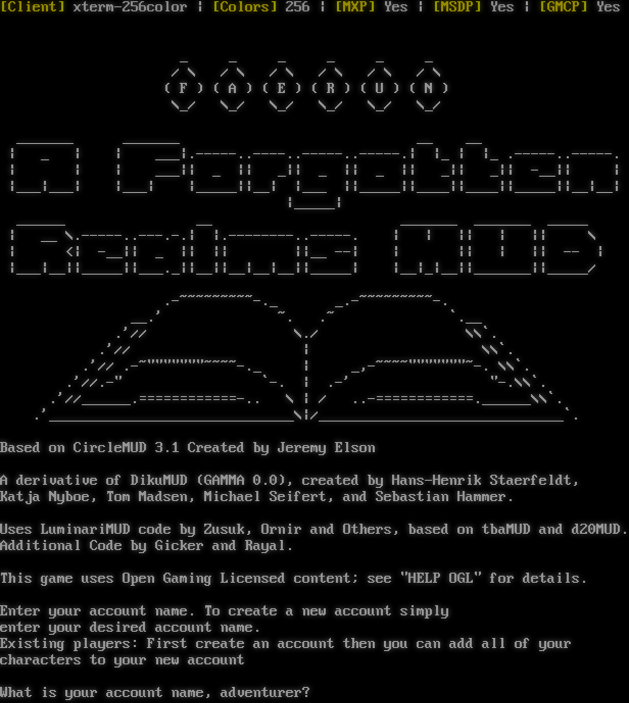 Attempting to Detect Client, Please Wait... [Client] xterm-256color \| [Colors] 256 \| [MXP] Yes \| [MSDP] Yes \| [GMCP] Yes _ _ _ _ _ _ / \\ / \\ / \\ / \\ / \\ / \\ ( F ) ( A ) ( E ) ( R ) ( U ) ( N ) \\_/ \\_/ \\_/ \\_/ \\_/ \\_/ _​______ _​______ __ __ \| _ \| \| ___\|.​-----..----..-----..-----.\| \|_ \| \|_ .​-----..-----. \| \| \| ___\|\| _ \|\| _\|\| _ \|\| _ \|\| _\|\| _\|\| -__\|\| \| \|___\|___\| \|___\| \|_​____\|\|__\| \|___ \|\|_​____\|\|_​___\|\|_​___\|\|_​____\|\|__\|__\| \|_​____\| _​_____ __ _​______ _​______ _​____ \| __ \\.​-----..---.-.\| \|.​--------..-----. \| \| \|\| \| \|\| \\ \| <\| -__\|\| _ \|\| \|\| \|\|__ --\| \| \|\| \| \|\| -- \| \|___\|__\|\|_​____\|\|_​__._\|\|__\|\|__\|__\|__\|\|_​____\| \|__\|_\|__\|\|_​______\|\|_​____/ .​-~~~~~~~~~-._ _​.-~~~~~~~~~-. __.' ~. .~ \`.__ .'// \\./ \\\\\`. .'// \| \\\\\`. .'// .​-~"""""""~~~~-._ \| _,-​~~~~"""""""~-. \\\\\`. .'//.-" \`-. \| .-' "-.\\\\\`. .'//_​_____.============-.. \\ \| / .​.-============.______\\\\\`. .'_​_____________________________\\\|/_​_____________________________\`. Based on CircleMUD 3.1 Created by Jeremy Elson A derivative of DikuMUD (GAMMA 0.0), created by Hans-Henrik Staerfeldt, Katja Nyboe, Tom Madsen, Michael Seifert, and Sebastian Hammer. Uses LuminariMUD code by Zusuk, Ornir and Others, based on tbaMUD and d20MUD. Additional Code by Gicker and Rayal. This game uses Open Gaming Licensed content; see "HELP OGL" for details. Enter your account name. To create a new account simply enter your desired account name. Existing players: First create an account then you can add all of your characters to your new account What is your account name, adventurer?