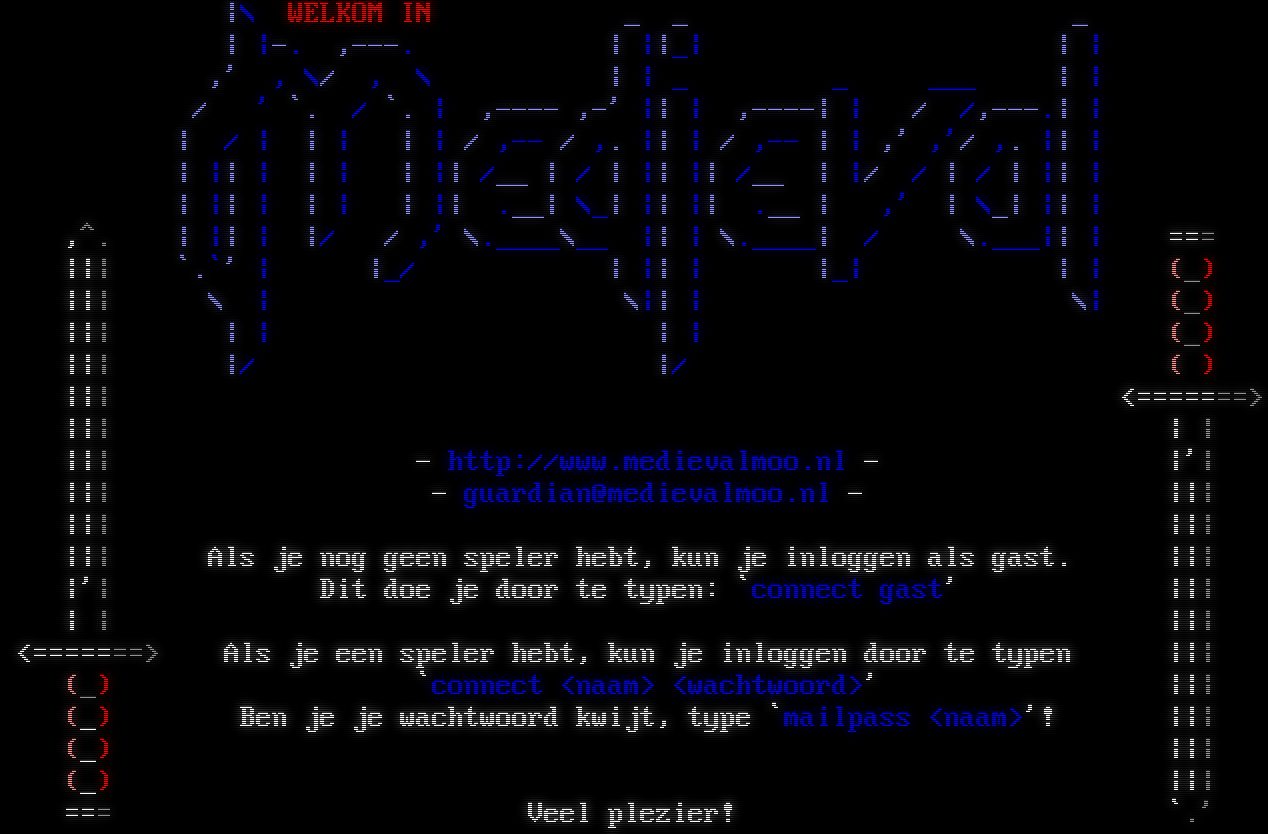 \|\\ WELKOM IN _ _ _ \| \|-. ,-​--. \| \|\|_\| \| \| ,' , \\/ , \\ \| \| _ _ ___ \| \| / ' \`. / \`. \| ,-​--- ,-' \|\| \| ,-​---\| \| / /,-​--.\| \| \| / \| \| \| \| \| / ,-- / ,. \|\| \| / ,-- \| \| ,' ,'/ ,. \|\| \| \| \|\| \| \| \| \| \|\| /__ \| / \| \|\| \|\| /__ \| \|/ / \| / \| \|\| \| \| \|\| \| \| \| \| \|\| .__\| \\_\| \|\| \|\| .__ \| ,' \| \\_\| \|\| \| ,^. \| \|\| \| \|/ / ,' \\.​____\\__ \|\| \| \\.​____\| / \\.​___\|\| \| === \|\|\| \`.\`' \| \|_/ \| \|\| \| \|_\| \| \| (_) \|\|\| \\ \| \\\|\| \| \\\| (_) \|\|\| \| \| \| \| (_) \|\|\| \|/ \|/ ( ) \|\|\| <=​======> \|\|\| \| \| \|\|\| - http://www.medievalmoo.nl - \|'\| \|\|\| - guardian@medievalmoo.nl - \|\|\| \|\|\| \|\|\| \|\|\| Als je nog geen speler hebt, kun je inloggen als gast. \|\|\| \|'\| Dit doe je door te typen: \`connect gast' \|\|\| \| \| \|\|\| <=​======> Als je een speler hebt, kun je inloggen door te typen \|\|\| (_) \`connect <naam> <wachtwoord>' \|\|\| (_) Ben je je wachtwoord kwijt, type \`mailpass <naam>'! \|\|\| (_) \|\|\| (_) \|\|\| === Veel plezier! \`.'