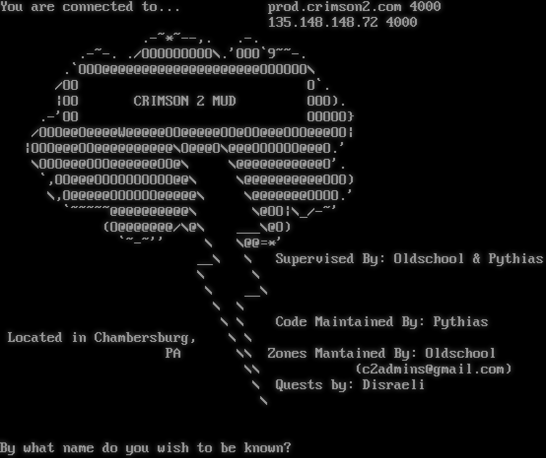 You are connected to... prod.crimson2.com 4000 135.148.148.72 4000 .-~\*~--,. .-. .​-~-. ./OOOOOOOOO\\.'OOO\`9~​~-. .\`OOO@@@@@@@@@@@@@@@@@@@@OOOOOO\\ /OO O\`. \|OO CRIMSON 2 MUD OOO). .-'OO OOOOO} /OOO@@O@@@@W@@@@@OO@@@@@OO@OO@@@OOO@@@OO\| \|OOO@@@OO@@@@@@@@@@\\O@@@O\\@@@OOOOOO@@@O.' \\OOO@@@OOO@@@@@@OO@\\ \\@@@@@@@@@@@O'. \`,OO@@@OOOOOOOOOO@@\\ \\@@@@@@@@@@OOO) \\,O@@@@@OOOOOO@@@@@\\ \\@@@@@@@OOOO.' \`~​~~~~@@@@@@@@@@\\ \\@OO\|\\_/-~' (O@@@@@@@/\\@\\ ___\\@O) \`~-~'' \\ \\@@=\*' __\\ \\ Supervised By: Oldschool & Pythias \\ \\ \\ __\\ \\ \\ \\ \\ Code Maintained By: Pythias Located in Chambersburg, \\ \\ PA \\\\ Zones Mantained By: Oldschool \\\\ (c2admins@gmail.com) \\ Quests by: Disraeli \\ By what name do you wish to be known?