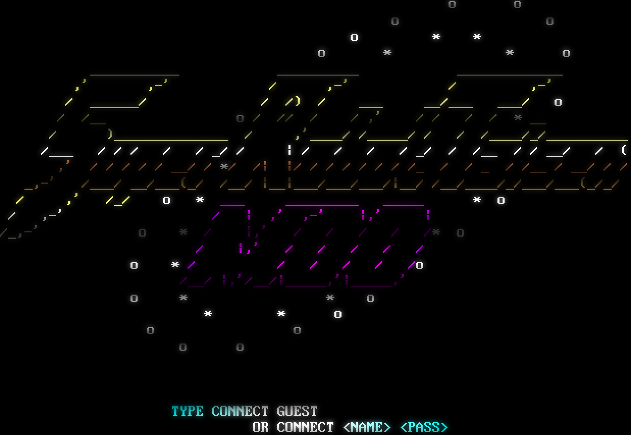 o o o o o \* \* o \* \* o _​__________ _​_________ _​____________ ,' ,-' / ,-' / ,-' / _​_____/ / /) / ___ __/___ ___/ o / /__ o / // / / ,' / / / / \* __ / )_​_____________ / ,'_​___/ /_​____/ / / /_​___/_/_​_________ /___ / / / / / _/ / \| / / / / _/ / /__ / / __/ / ( ,' / / / / / __/ / \*/ /\| \|/ / / / / / / /_ / / _ / /__ / __/ / / _,-' /___/ __/___(_/ /__/ \|__\|___/___/___/\|__/ /__/_​___/_/___/___(_/_/ / ,' /_/ o \* ___ _​________ _​____ \* o / ,-' / \| ,' ,-' \|,' \| /_,-' o \* / \|,' / / / / /\* o / \|,' / / / / / o \* / / / / / /o /__/ \|,'/__/\|_​____,'\|_​____,' o \* \* o \* \* o o o o o TYPE CONNECT GUEST OR CONNECT <NAME> <PASS>
