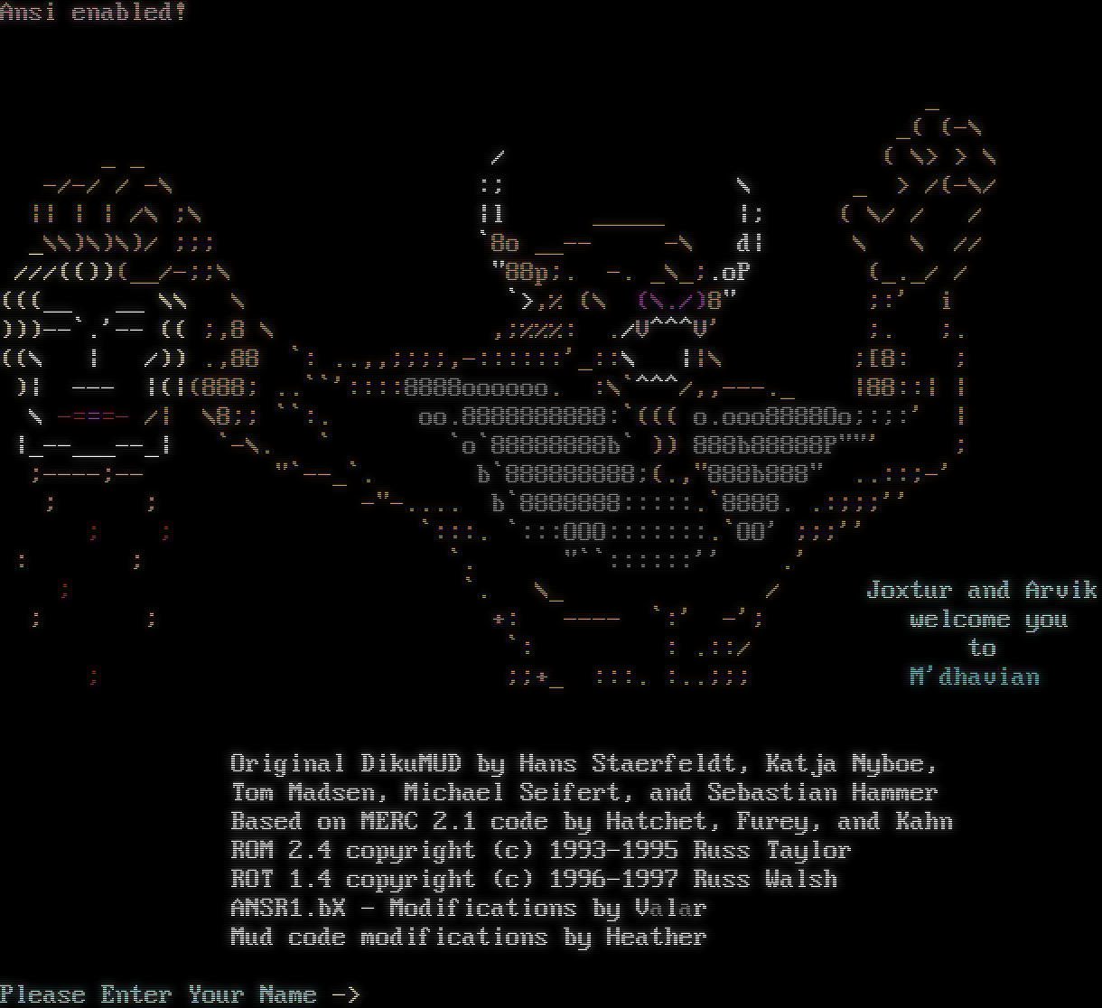 Ansi enabled! _ _( (-\\ _ _ / ( \\> > \\ -/-/ / -\\ :; \\ _ > /(-\\/ \|\| \| \| /\\ ;\\ \|l _​____ \|; ( \\/ / / _\\\\)\\)\\)/ ;;; \`8o _​_-- -\\ d\| \\ \\ // ///(())(__/-;;\\ "88p;. -. _\\_;.oP (_._/ / (((__ __ \\\\ \\ \`>,% (\\ (\\./)8" ;:' i )))--\`.'-- (( ;,8 \\ ,;%%%: ./V^^^V' ;. ;. ((\\ \| /)) .,88 \`: ..,,;;;;,-::::::'_::\\ \|\|\\ ;[8: ; )\| --- \|(\|(888; ..\`\`'::::8888oooooo. :\\\`^^^/,,-​--._ \|88::\| \| \\ -​===- /\| \\8;; \`\`:. oo.8888888888:\`((( o.ooo8888Oo;:;:' \| \|_​--___--_\| \`-\\. \` \`o\`88888888b\` )) 888b88888P""' ; ;-​---;-- "\`--_\`. b\`888888888;(.,"888b888" ..::;-' ; ; -​"-.... b\`8888888:::::.\`8888. .:;;;'' ; ; \`:::. \`:::OOO:::::::.\`OO' ;;;'' : ; \`. "\`\`::::::'' .' ; \`. \\_ / Joxtur and Arvik ; ; +: -​--- \`:' -'; welcome you \`: : .::/ to ; ;;+_ :::. :..;;; M'dhavian Original DikuMUD by Hans Staerfeldt, Katja Nyboe, Tom Madsen, Michael Seifert, and Sebastian Hammer Based on MERC 2.1 code by Hatchet, Furey, and Kahn ROM 2.4 copyright (c) 1993-1995 Russ Taylor ROT 1.4 copyright (c) 1996-1997 Russ Walsh ANSR1.bX - Modifications by Valar Mud code modifications by Heather Please Enter Your Name ->