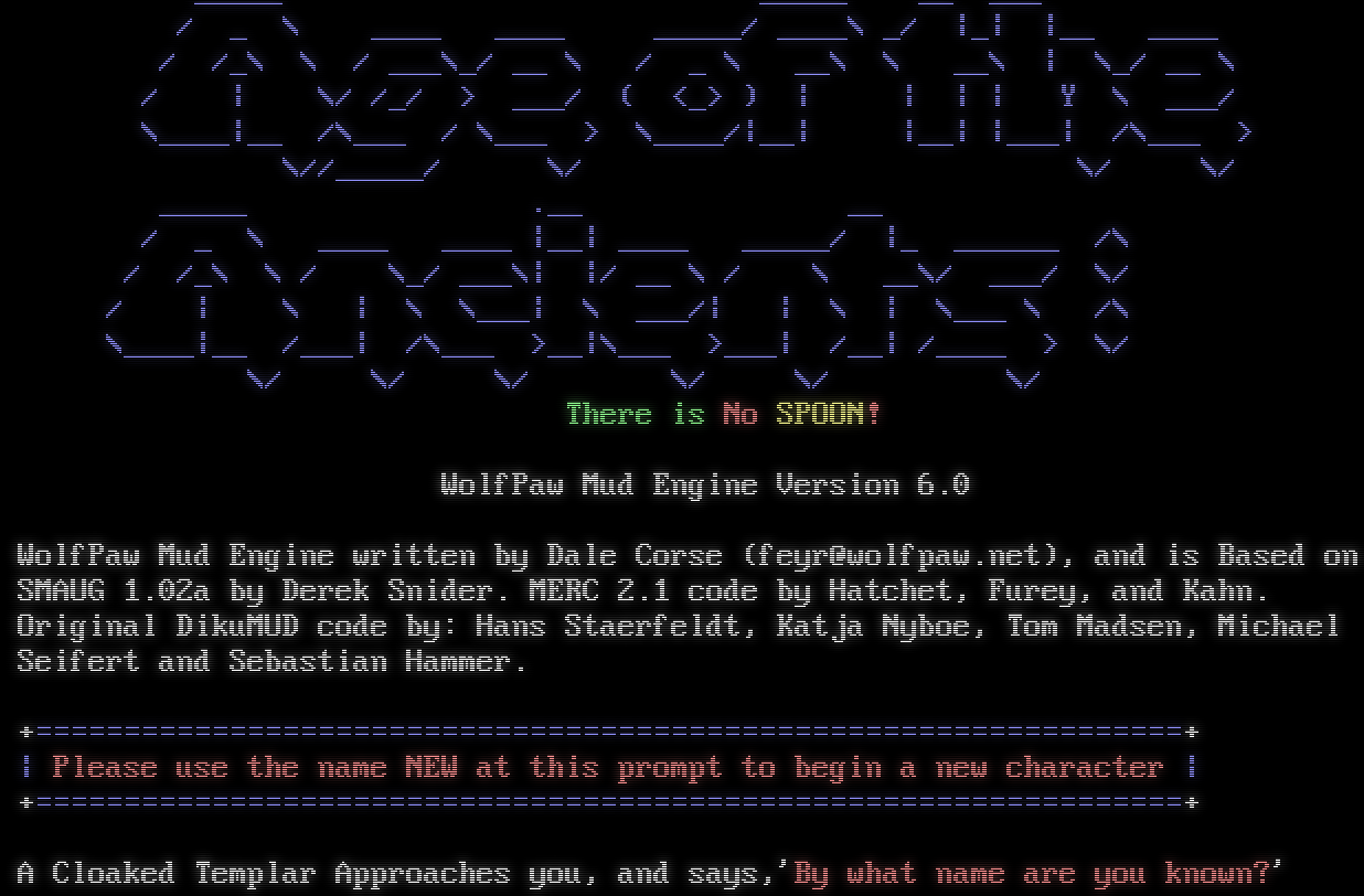 _​____ _​____ __ ___ / _ \\ _​___ _​___ _​____/ _​___\\ _/ \|_\| \|__ _​___ / /_\\ \\ / ___\\_/ __ \\ / _ \\ __\\ \\ __\\ \| \\_/ __ \\ / \| \\/ /_/ > ___/ ( <_> ) \| \| \| \| Y \\ ___/ \\_​___\|__ /\\___ / \\___ > \\_​___/\|__\| \|__\| \|___\| /\\___ > \\//_​____/ \\/ \\/ \\/ _​____ .__ __ / _ \\ _​___ _​___ \|__\| _​___ _​____/ \|_ _​_____ /\\ / /_\\ \\ / \\_/ ___\\\| \|/ __ \\ / \\ __\\/ ___/ \\/ / \| \\ \| \\ \\___\| \\ ___/\| \| \\ \| \\___ \\ /\\ \\_​___\|__ /___\| /\\___ >__\|\\___ >___\| /__\| /_​___ > \\/ \\/ \\/ \\/ \\/ \\/ \\/ There is No SPOON! WolfPaw Mud Engine Version 6.0 WolfPaw Mud Engine written by Dale Corse (feyr@wolfpaw.net), and is Based on SMAUG 1.02a by Derek Snider. MERC 2.1 code by Hatchet, Furey, and Kahn. Original DikuMUD code by: Hans Staerfeldt, Katja Nyboe, Tom Madsen, Michael Seifert and Sebastian Hammer. +​=================================================================+ \| Please use the name NEW at this prompt to begin a new character \| +​=================================================================+ A Cloaked Templar Approaches you, and says,'By what name are you known?'