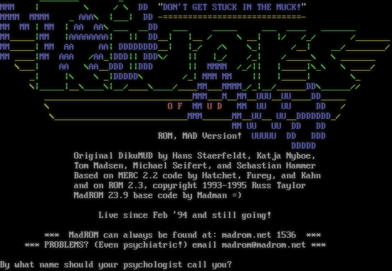 _​_______ _ MMM \| \\ / \\ DD "DON'T GET STUCK IN THE MUCK!" MMMM MMMM _ AAA\\ \|___\| DD -​============================- MM MM \| MM \| AA AA\\ ___ __DD ___ _​____ ___ _​___ _​______ MM_​____\|MM \|AAAAAAAA\| \|\| DD__\| \|__ / \\ __\| \|/ /_/ /_​______ MM_​____\| MM AA AA\| DDDDDDDD__\| \|_/ /\\ \\_\| /__\| __/_​_______/ MM _​___\|MM AAA /AA_\|DDD\|\| DDD\\/ \|\| \|_/ /_\| /_​____\\ \\ _​______ \\___\| AA \\AA__DDD \|\|DDD \|\| MMMM /_/\|\| \|_​____\|\\_\\ \\ _​___/ _\| \|\\ \\ _\|DDDDD\\ /_\| MMM MM \|\| \|_​____\| \\_ \\\|_​____\|__\\_​___\\\|__/_​___\\_​___/_​___MM___MMMM_/_\|__/_​_____DD\\_​_____// _​_____________________________MMM___M__MM__UUU__UU_​___DD_​____ \\ O F MM U D MM UU UU DD / \\_​__________________________MMM_​_____MM__UU__ UU__DDDDDDD_/ MM UU UU DD DD ROM, MAD Version! UUUUU DD DDD DDDDD Original DikuMUD by Hans Staerfeldt, Katja Nyboe, Tom Madsen, Michael Seifert, and Sebastian Hammer Based on MERC 2.2 code by Hatchet, Furey, and Kahn and on ROM 2.3, copyright 1993-1995 Russ Taylor MadROM 23.9 base code by Madman =) Live since Feb '94 and still going! \*\*\* MadROM can always be found at: madrom.net 1536 \*\*\* \*\*\* PROBLEMS? (Even psychiatric!) email madrom@madrom.net \*\*\* By what name should your psychologist call you?