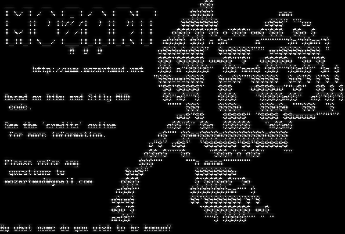 __ __ __ ___ __ ___ ___ o$$ \| \\/ \| / \\ \| _ \| / \\ \| \\\| \| $$$$$ ooo \| \|\| ) \|\|// /\| ) \|\| )\| \| \| $$$$$$$$ o$$$" ""oo \| \\/ \|\| \| / /\|\| \|\| / \| \| o$$$"$$"$$ o"$$$"oo$"$$$ $$o $ \|_\|\|_\| \\__/ \|___\|\|_\|\|_\|\|_\|_\\ \|_\| o$$$$ $$$ o $o" o"​"""""$o"$$oo"$ M U D o$$$o$o$$$" $o$$$$$""" oo$$$$$o$$$ " $$$"$$$$$$ ooo$$""$" o$$$$$o "$o"$$ http://www.mozartmud.net $$$ o"$$$$$" $$$"ooo$ $$$""$$o$$" $o $ "$$$ooo$$$$ $oo$$""$$$$$$ $o$"$ $"$ $ "$$"$$$$$" $$$ o$$$$oo""o$" $$ $ $ Based on Diku and Silly MUD $$"o$""$ $$$$ "$$$$$o$$" o$"$$"$ code. """ $$$ $$$$o $$$o$o ""$$$ "$ oo$"$$ $$$$$" "$$$$ $$ooooo"​"""" See the 'credits' online o$$"$" $$o $$$$$$ "o$$o$ for more information. o$"" $$oo$$$$o$$$$$$$$$o$$$$ o"$" o$$" "$$$$$$$"$$"$$$$$$$ o$$o$"""$o "$$$o"o"o$$" "" Please refer any $$$"" ""o oooo"​""""" questions to $o$$" $$$$$$$$o mozartmud@gmail.com o$$$ $"$$$$o$""$o o$$$" $$$$$$$$oo"" $ o$oo$ $$"$$$$$$$$"$"$ o$o"$ "$$$$$$$$$$ oo$ oo$$" ""$ $$$$$"" " " By what name do you wish to be known?