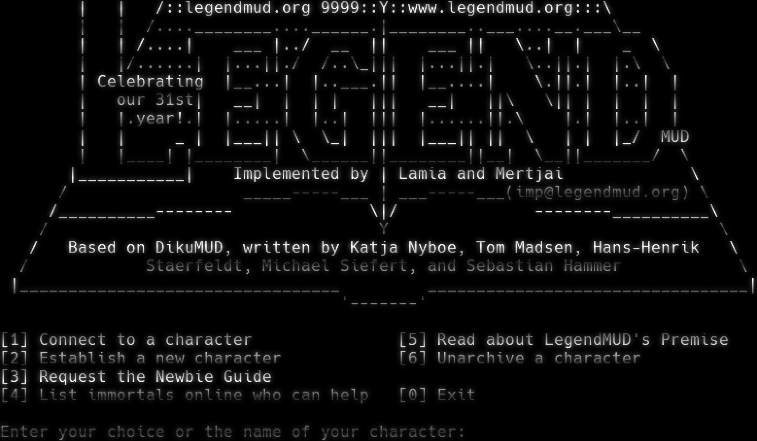 _​____ _​___---___ _​__---____ \| \| _​____-----:::::::::::\\ /:::::::::::-​----_____ \| \| /::legendmud.org 9999::Y::www.legendmud.org:::\\ \| \| /.​...________....______.\|_​_______..___....__.___\\__ \| \| /.​...\| ___ \|../ __ \|\| ___ \|\| \\..\| \| _ \\ \| \|/.​.....\| \|...\|\|./ /..\\_\|\|\| \|...\|\|.\| \\..\|\|.\| \|.\\ \\ \| Celebrating \|_​_...\| \|.​.___.\|\| \|_​_....\| \\.\|\|.\| \|..\| \| \| our 31st\| __\| \| \| \| \|\|\| __\| \|\|\\ \\\|\| \| \| \| \| \| \|.year!.\| \|.​....\| \|..\| \|\|\| \|.​.....\|\|.\\ \|.\| \|..\| \| \| \| _ \| \|___\|\| \\ \\_\| \|\|\| \|___\|\| \|\| \\ \| \| \|_/ MUD \| \|_​___\| \|_​_______\| \\_​_____\|\|_​_______\|\|__\| \\__\|\|_​______/ \\ \|_​__________\| Implemented by \| Lamia and Mertjai \\ / _​____-----___ \| _​__-----___(imp@legendmud.org) \\ /_​_________-------- \\\|/ -​-------__________\\ / Y \\ / Based on DikuMUD, written by Katja Nyboe, Tom Madsen, Hans-Henrik \\ / Staerfeldt, Michael Siefert, and Sebastian Hammer \\ \|_​________________________________ _​________________________________\| '-​------' [1] Connect to a character [5] Read about LegendMUD's Premise [2] Establish a new character [6] Unarchive a character [3] Request the Newbie Guide [4] List immortals online who can help [0] Exit Enter your choice or the name of your character: <!-- Elements to support the Automapper --><!ELEMENT RName FLAG="RoomName"><!ELEMENT RDesc FLAG='RoomDesc'><!ELEMENT RExits FLAG='RoomExit'><!-- The next element is used to define a room exit link that sendsthe exit direction to the MUD if the user clicks on it --><!ELEMENT Ex '<SEND>'><!ELEMENT Chat OPEN><!ELEMENT Gossip OPEN><!-- in addition to standard HTML Color specifications, you can usecolor attribute names such as blink --><!ELEMENT Auction OPEN><!ELEMENT Group OPEN><!-- the next elements deal with the MUD prompt --><!ELEMENT Prompt FLAG="Prompt"><!ELEMENT Hp FLAG="Set hp"><!ELEMENT MaxHp FLAG="Set maxhp"><!ELEMENT Mana FLAG="Set mana"><!ELEMENT MaxMana FLAG="Set maxmana">