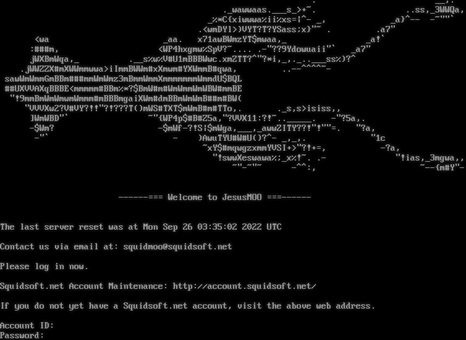 . __,. ._wawwaas.​___s_>+~. ..ss,_3WWQa, _%\*C{xiwwwa%ii%xs=\|^- _, _a}^-- -​~""\` .<wmDYl>)VYT?T?YSass;x}"~ . .a7" <wa _aa. x71awBWmzYT$mwaa,_ _a!\` :###m, <WP4hxgmw%SpV?~​.... .-"??9Ydowuaii"\` _a7" jWXBmWqa,_ .__s%w%V#U1mBBBWwc.xmZTT?^"?\*i,_,.​_..___ss%)?^ .jWWZZX#mXWWmmwwa>iImmBWWm#xXmwm#YXWmmB#qwa, .​.--^^^^~- sawWmWmmGmBBm###mmWmWmz3mBmmWmmXmmmmmmmWmmdU$BQL ##UXVVAXqBBBE<mmmmm#BBm%\*?$BmW#m#WmWmmWmWBW#mmBE "!9mmBmWmWmwmWmmm#mBBBmgaiXWm#dmBBmWmWmB##m#BW( "VVVXw2?V#VY?!!"?!???T()mWS#TXT$mWmB#m#TTo,. ._s,s>isiss,, ]WmWBD"\` ~"{WP4p$#B#Z5a,"?VVX11:?!~​.._____. -"?5a,. -$Wm? -$mWf-?!S\|$mWga,___,_awwZITY??!"!"​"=. "?a, -"\` - )AwuTYU#W#U()?^- _,_,. "1c ~xY$#mqwgzxmmYVSI+>"?!+=, -?a, "!swwXeswawa%;_x%!~. .- "!ias,_3mgwa,, ~​"-~"~ -^^:, ~--{m#Y"- -​-----=== Welcome to JesusMOO =​==------ The last server reset was at Mon Sep 26 03:35:02 2022 UTC Contact us via email at: squidmoo@squidsoft.net Please log in now. Squidsoft.net Account Maintenance: http://account.squidsoft.net/ If you do not yet have a Squidsoft.net account, visit the above web address. Account ID: Password: