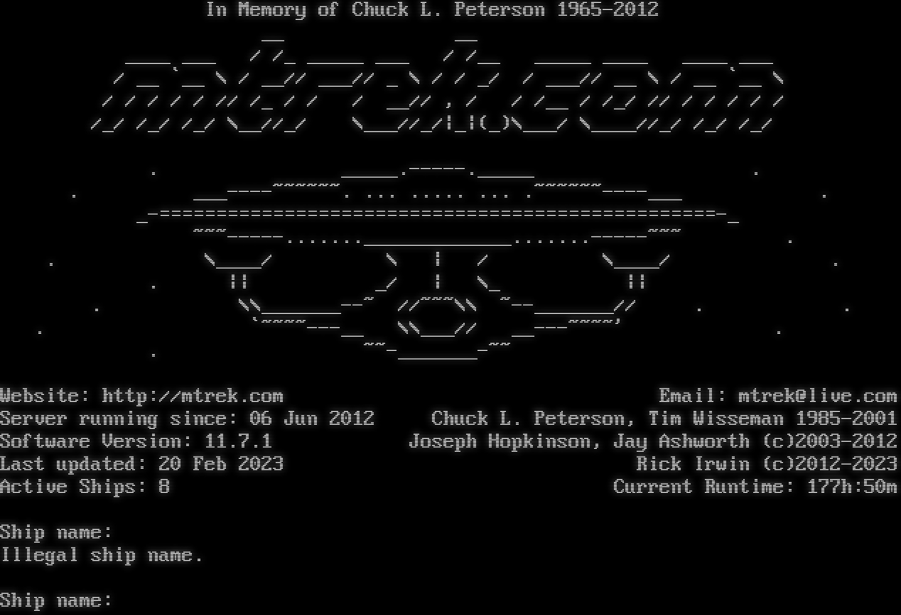 In Memory of Chuck L. Peterson 1965-2012 __ __ _​___ ___ / /_ _​____ ___ / /__ _​____ _​___ _​___ ___ / __ \`__ \\ / __// ___// _ \\ / / _/ / ___// __ \\ / __ \`__ \\ / / / / / // /_ / / / __// , / / /__ / /_/ // / / / / / /_/ /_/ /_/ \\__//_/ \\___//_/\|_\|(_)\\___/ \\_​___//_/ /_/ /_/ . _​____.-----._____ . . _​__----~~~~~~. ... .​.... ... .​~~~~~~----___ . _​-=================================================-_ ~​~~-----......._____________.......-----~~~ . . \\_​___/ \\ \| / \\_​___/ . . \|\| _/ \| \\_ \|\| . \\\\_​______--~ //~~~\\\\ ~​--_______// . . . \`~​~~~---__ \\\\___// _​_---~~~~' . . ~​~-_______-~~ Website: http://mtrek.com Email: mtrek@live.com Server running since: 06 Jun 2012 Chuck L. Peterson, Tim Wisseman 1985-2001 Software Version: 11.7.1 Joseph Hopkinson, Jay Ashworth (c)2003-2012 Last updated: 20 Feb 2023 Rick Irwin (c)2012-2023 Active Ships: 8 Current Runtime: 177h:50m Ship name: Illegal ship name. Ship name: