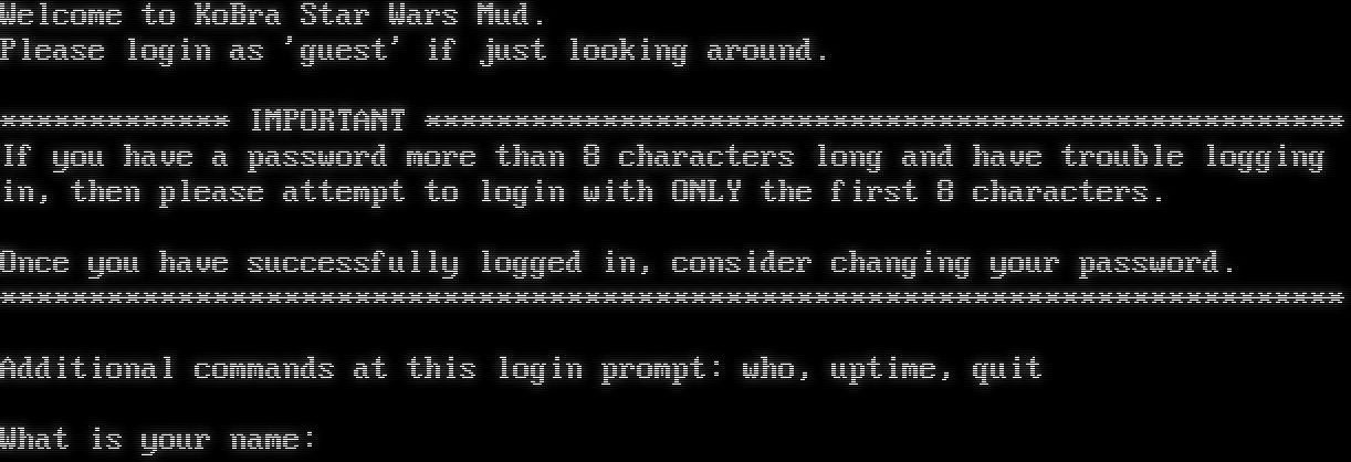 Welcome to KoBra Star Wars Mud. Please login as 'guest' if just looking around. \*\*\*\*\*\*\*\*\*\*\*\*\* IMPORTANT \*\*\*\*\*\*\*\*\*\*\*\*\*\*\*\*\*\*\*\*\*\*\*\*\*\*\*\*\*\*\*\*\*\*\*\*\*\*\*\*\*\*\*\*\*\*\*\*\*\*\*\* If you have a password more than 8 characters long and have trouble logging in, then please attempt to login with ONLY the first 8 characters. Once you have successfully logged in, consider changing your password. \*\*\*\*\*\*\*\*\*\*\*\*\*\*\*\*\*\*\*\*\*\*\*\*\*\*\*\*\*\*\*\*\*\*\*\*\*\*\*\*\*\*\*\*\*\*\*\*\*\*\*\*\*\*\*\*\*\*\*\*\*\*\*\*\*\*\*\*\*\*\*\*\*\*\*\* Additional commands at this login prompt: who, uptime, quit What is your name: