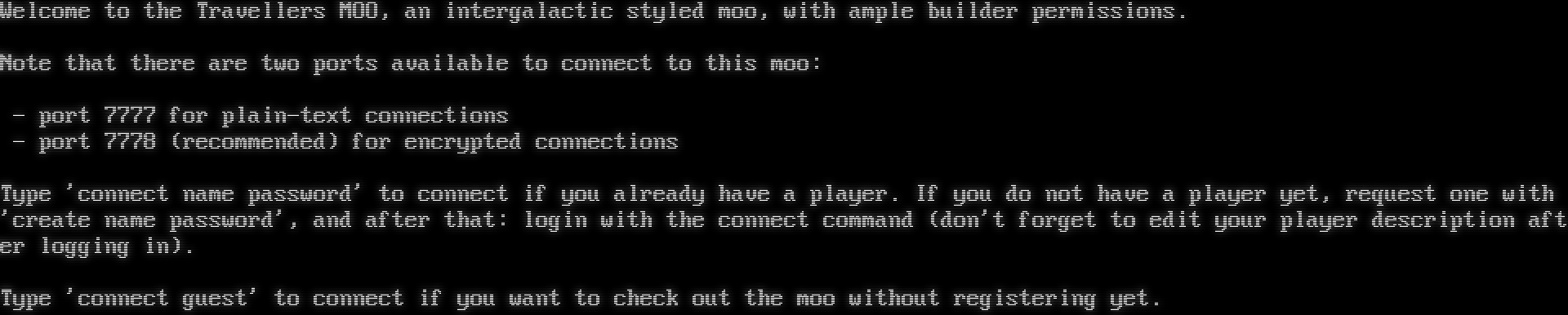 Welcome to the Travellers MOO, an intergalactic styled moo, with ample builder permissions. Note that there are two ports available to connect to this moo: - port 7777 for plain-text connections - port 7778 (recommended) for encrypted connections Type 'connect name password' to connect if you already have a player. If you do not have a player yet, request one with 'create name password', and after that: login with the connect command (don't forget to edit your player description after logging in). Type 'connect guest' to connect if you want to check out the moo without registering yet.