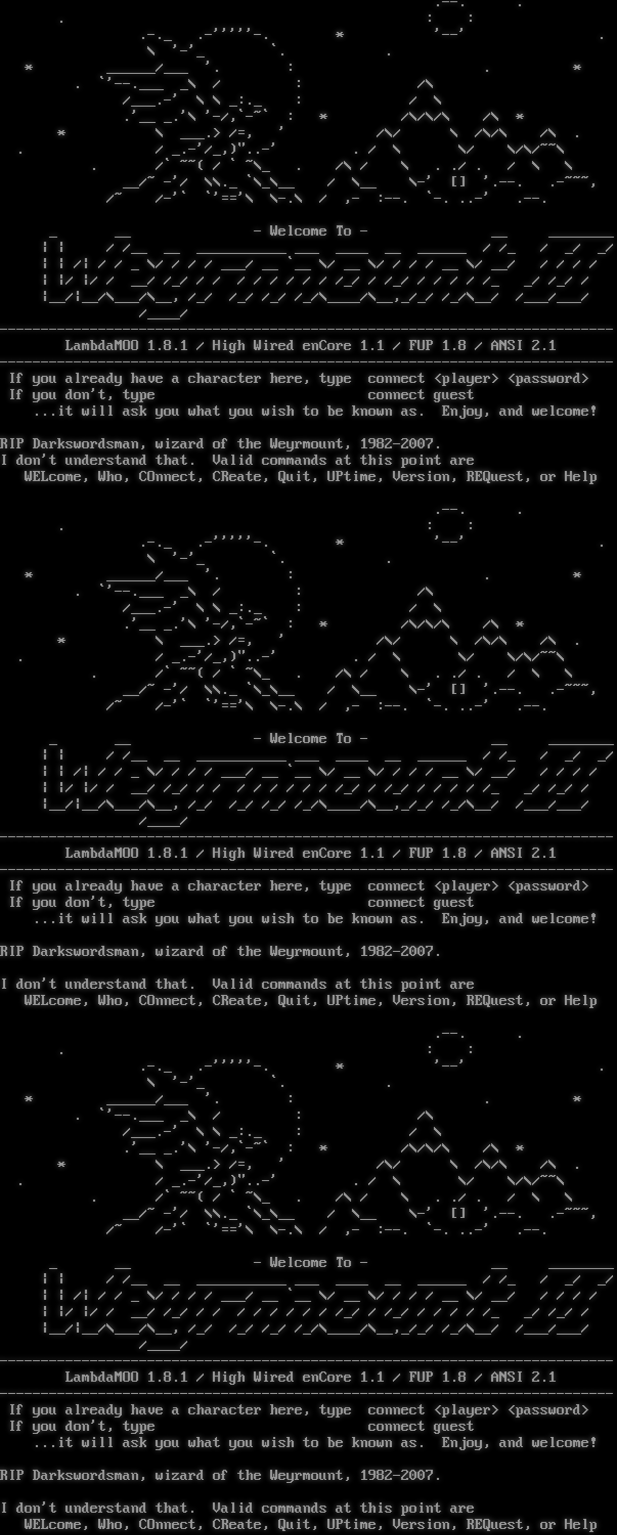 .​--. . . : : .​-._ .-'''''-. \* '--' . \\ '-'_ \`. . \* _​_____/___ '. : . \* . \`'-​-.___ _\\ / : /\\ /_​__.-' \\ \\ _:._ : / \\ .'__ _.'\\ '-/,\`-~\` : \* /\\/\\/\\ /\\ \* \* \\ _​__.> /=, ' /\\/ \\ /\\/\\ /\\ . . / _.-'/_,)"​..-' . / \\ \\/ \\/\\/~~\\ . /\` ~~( / \` ~\\_ . /\\ / \\ . ./ . / \\ \\ __/~ -'/ \\\\._ \`\\_\\__ / \\__ \\-' [] '.​--. .​-~~~, /~ /-'\` \`'=='\\ \\-.\\ / ,- :--. \`-. ..-' .​--. _ __ - Welcome To - __ _​_______ \| \| / /__ __ _​__________ ___ _​___ __ _​_____ / /_ / _/ _/ \| \| /\| / / _ \\/ / / / ___/ __ \`__ \\/ __ \\/ / / / __ \\/ __/ / / / / \| \|/ \|/ / __/ /_/ / / / / / / / / /_/ / /_/ / / / / /_ _/ /_/ / \|__/\|__/\\___/\\__, /_/ /_/ /_/ /_/\\_​___/\\__,_/_/ /_/\\__/ /___/___/ /_​___/ -​-------------------------------------------------------------------------- LambdaMOO 1.8.1 / High Wired enCore 1.1 / FUP 1.8 / ANSI 2.1 -​-------------------------------------------------------------------------- If you already have a character here, type connect <player> <password> If you don't, type connect guest ...it will ask you what you wish to be known as. Enjoy, and welcome! RIP Darkswordsman, wizard of the Weyrmount, 1982-2007. I don't understand that. Valid commands at this point are WELcome, Who, COnnect, CReate, Quit, UPtime, Version, REQuest, or Help .​--. . . : : .​-._ .-'''''-. \* '--' . \\ '-'_ \`. . \* _​_____/___ '. : . \* . \`'-​-.___ _\\ / : /\\ /_​__.-' \\ \\ _:._ : / \\ .'__ _.'\\ '-/,\`-~\` : \* /\\/\\/\\ /\\ \* \* \\ _​__.> /=, ' /\\/ \\ /\\/\\ /\\ . . / _.-'/_,)"​..-' . / \\ \\/ \\/\\/~~\\ . /\` ~~( / \` ~\\_ . /\\ / \\ . ./ . / \\ \\ __/~ -'/ \\\\._ \`\\_\\__ / \\__ \\-' [] '.​--. .​-~~~, /~ /-'\` \`'=='\\ \\-.\\ / ,- :--. \`-. ..-' .​--. _ __ - Welcome To - __ _​_______ \| \| / /__ __ _​__________ ___ _​___ __ _​_____ / /_ / _/ _/ \| \| /\| / / _ \\/ / / / ___/ __ \`__ \\/ __ \\/ / / / __ \\/ __/ / / / / \| \|/ \|/ / __/ /_/ / / / / / / / / /_/ / /_/ / / / / /_ _/ /_/ / \|__/\|__/\\___/\\__, /_/ /_/ /_/ /_/\\_​___/\\__,_/_/ /_/\\__/ /___/___/ /_​___/ -​-------------------------------------------------------------------------- LambdaMOO 1.8.1 / High Wired enCore 1.1 / FUP 1.8 / ANSI 2.1 -​-------------------------------------------------------------------------- If you already have a character here, type connect <player> <password> If you don't, type connect guest ...it will ask you what you wish to be known as. Enjoy, and welcome! RIP Darkswordsman, wizard of the Weyrmount, 1982-2007. I don't understand that. Valid commands at this point are WELcome, Who, COnnect, CReate, Quit, UPtime, Version, REQuest, or Help .​--. . . : : .​-._ .-'''''-. \* '--' . \\ '-'_ \`. . \* _​_____/___ '. : . \* . \`'-​-.___ _\\ / : /\\ /_​__.-' \\ \\ _:._ : / \\ .'__ _.'\\ '-/,\`-~\` : \* /\\/\\/\\ /\\ \* \* \\ _​__.> /=, ' /\\/ \\ /\\/\\ /\\ . . / _.-'/_,)"​..-' . / \\ \\/ \\/\\/~~\\ . /\` ~~( / \` ~\\_ . /\\ / \\ . ./ . / \\ \\ __/~ -'/ \\\\._ \`\\_\\__ / \\__ \\-' [] '.​--. .​-~~~, /~ /-'\` \`'=='\\ \\-.\\ / ,- :--. \`-. ..-' .​--. _ __ - Welcome To - __ _​_______ \| \| / /__ __ _​__________ ___ _​___ __ _​_____ / /_ / _/ _/ \| \| /\| / / _ \\/ / / / ___/ __ \`__ \\/ __ \\/ / / / __ \\/ __/ / / / / \| \|/ \|/ / __/ /_/ / / / / / / / / /_/ / /_/ / / / / /_ _/ /_/ / \|__/\|__/\\___/\\__, /_/ /_/ /_/ /_/\\_​___/\\__,_/_/ /_/\\__/ /___/___/ /_​___/ -​-------------------------------------------------------------------------- LambdaMOO 1.8.1 / High Wired enCore 1.1 / FUP 1.8 / ANSI 2.1 -​-------------------------------------------------------------------------- If you already have a character here, type connect <player> <password> If you don't, type connect guest ...it will ask you what you wish to be known as. Enjoy, and welcome! RIP Darkswordsman, wizard of the Weyrmount, 1982-2007. I don't understand that. Valid commands at this point are WELcome, Who, COnnect, CReate, Quit, UPtime, Version, REQuest, or Help