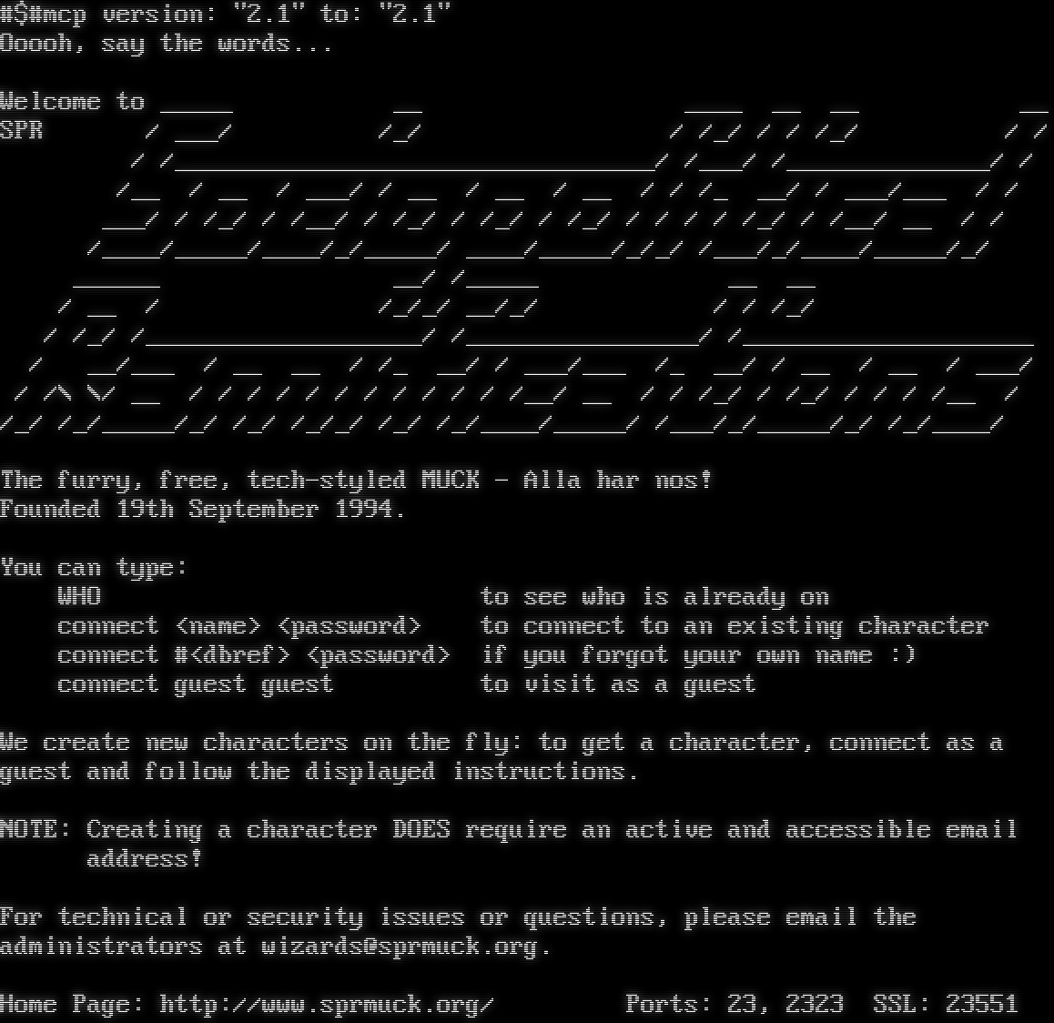 #$#mcp version: "2.1" to: "2.1" Ooooh, say the words... Welcome to _​____ __ _​___ __ __ __ SPR / ___/ /_/ / /_/ / / /_/ / / / /_​________________________________/ /___/ /_​_____________/ / /__ / __ / ___/ / __ / __ / __ / / /_ __/ / ___/___ / / ___/ / /_/ / /__/ / /_/ / /_/ / /_/ / / / / /_/ / /__/ __ / / /_​___/_​____/_​___/_/_​____/ _​___/_​____/_/_/ /___/_/_​___/_​____/_/ _​_____ __/ /_​____ __ __ / __ / /_/_/ __/_/ / / /_/ / /_/ /_​__________________/ /_​_______________/ /_​___________________ / __/___ / __ __ / /_ __/ / ___/___ /_ __/ / __ / __ / ___/ / /\\ \\/ __ / / / / / / / / / / / /__/ __ / / /_/ / /_/ / / / /__ / /_/ /_/_​____/_/ /_/ /_/_/ /_/ /_/_​___/_​____/ /___/_/_​____/_/ /_/_​___/ The furry, free, tech-styled MUCK - Alla har nos! Founded 19th September 1994. You can type: WHO to see who is already on connect <name> <password> to connect to an existing character connect #<dbref> <password> if you forgot your own name :) connect guest guest to visit as a guest We create new characters on the fly: to get a character, connect as a guest and follow the displayed instructions. NOTE: Creating a character DOES require an active and accessible email address! For technical or security issues or questions, please email the administrators at wizards@sprmuck.org. Home Page: http://www.sprmuck.org/ Ports: 23, 2323 SSL: 23551
