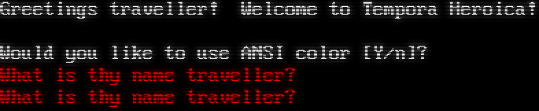 Greetings traveller! Welcome to Tempora Heroica! Would you like to use ANSI color [Y/n]? What is thy name traveller? What is thy name traveller?