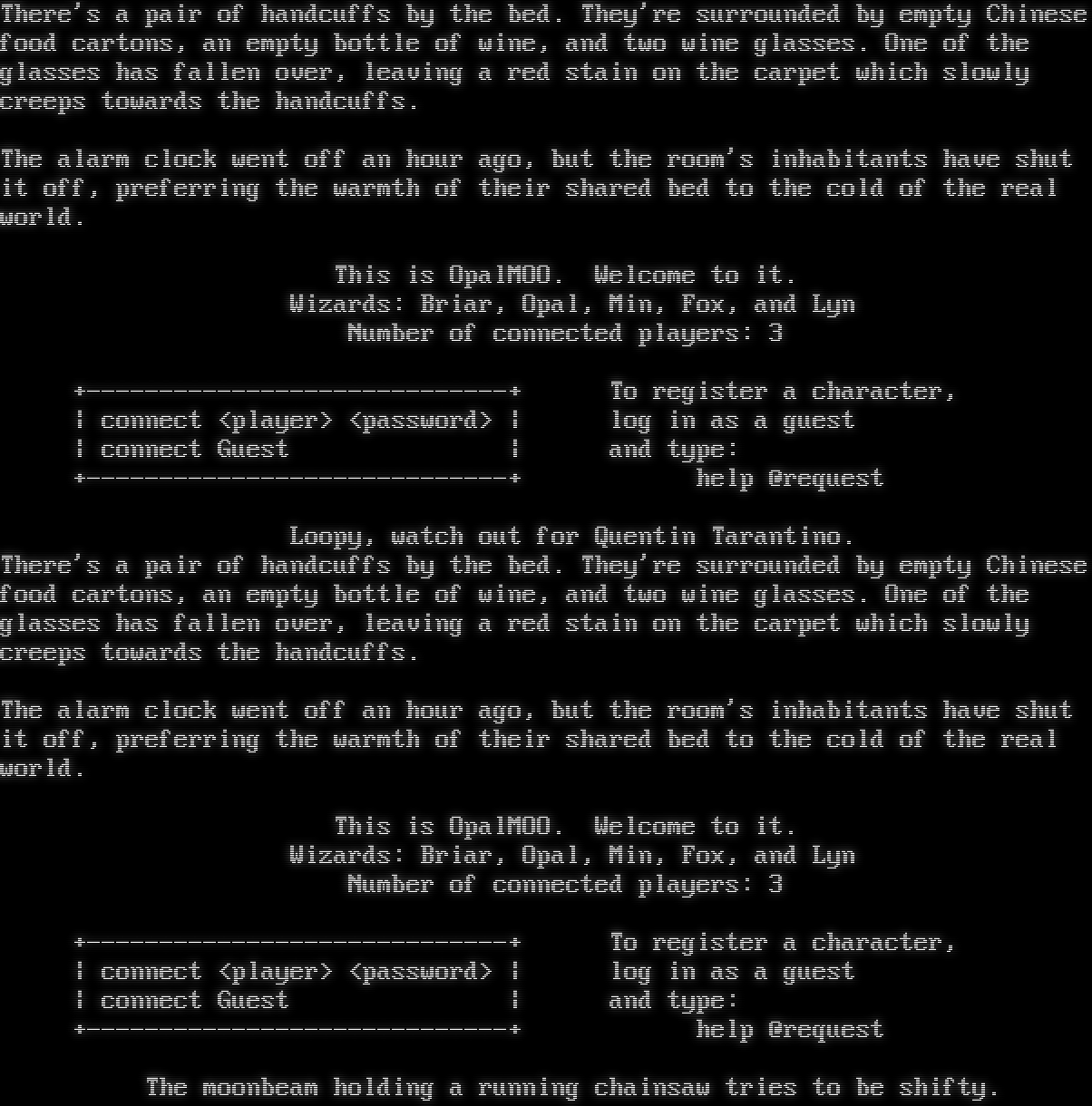 There's a pair of handcuffs by the bed. They're surrounded by empty Chinese food cartons, an empty bottle of wine, and two wine glasses. One of the glasses has fallen over, leaving a red stain on the carpet which slowly creeps towards the handcuffs. The alarm clock went off an hour ago, but the room's inhabitants have shut it off, preferring the warmth of their shared bed to the cold of the real world. This is OpalMOO. Welcome to it. Wizards: Briar, Opal, Min, Fox, and Lyn Number of connected players: 3 +​-----------------------------+ To register a character, \| connect <player> <password> \| log in as a guest \| connect Guest \| and type: +​-----------------------------+ help @request Loopy, watch out for Quentin Tarantino. There's a pair of handcuffs by the bed. They're surrounded by empty Chinese food cartons, an empty bottle of wine, and two wine glasses. One of the glasses has fallen over, leaving a red stain on the carpet which slowly creeps towards the handcuffs. The alarm clock went off an hour ago, but the room's inhabitants have shut it off, preferring the warmth of their shared bed to the cold of the real world. This is OpalMOO. Welcome to it. Wizards: Briar, Opal, Min, Fox, and Lyn Number of connected players: 3 +​-----------------------------+ To register a character, \| connect <player> <password> \| log in as a guest \| connect Guest \| and type: +​-----------------------------+ help @request The moonbeam holding a running chainsaw tries to be shifty.