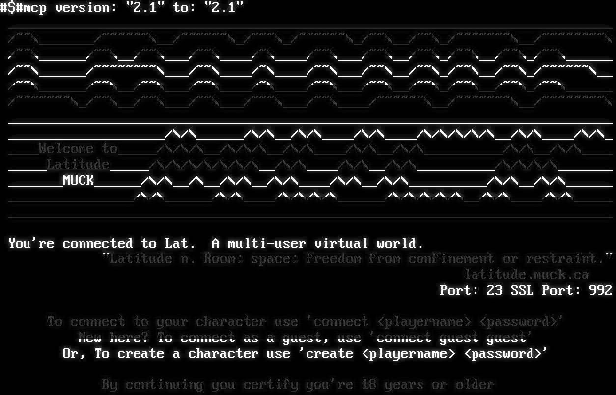 #$#mcp version: "2.1" to: "2.1" _​____________________________________________________________________________ /~~\\_​______/~​~~~~~\\__/~​~~~~~\\_/~~~\\_/~​~~~~~\\_/~~\\__/~~\\_/~​~~~~~~\\__/~​~~~~~~~\\ /~~\\_​_____/~~\\__/~~\\___/~~\\_​___/~\\_​___/~~\\___/~~\\__/~~\\_/~~\\__/~~\\_/~~\\_​_____ /~~\\_​_____/~​~~~~~~~\\___/~~\\_​___/~\\_​___/~~\\___/~~\\__/~~\\_/~~\\__/~~\\_/~​~~~~~\\__ /~~\\_​_____/~~\\__/~~\\___/~~\\_​___/~\\_​___/~~\\___/~~\\__/~~\\_/~~\\__/~~\\_/~~\\_​_____ /~​~~~~~~\\_/~~\\__/~~\\___/~~\\___/~~~\\___/~~\\_​___/~​~~~~~\\__/~​~~~~~~\\__/~​~~~~~~~\\ _​____________________________________________________________________________ _​___________________/\\/\\_​_____/\\/\\__/\\/\\_​___/\\/\\_​___/\\/\\/\\/\\/\\__/\\/\\_​___/\\/\\_ _​___Welcome to_​____/\\/\\/\\__/\\/\\/\\__/\\/\\_​___/\\/\\__/\\/\\_​_________/\\/\\__/\\/\\_​___ _​____Latitude_​____/\\/\\/\\/\\/\\/\\/\\__/\\/\\_​___/\\/\\__/\\/\\_​_________/\\/\\/\\/\\_​______ _​______MUCK_​_____/\\/\\__/\\__/\\/\\__/\\/\\_​___/\\/\\__/\\/\\_​_________/\\/\\__/\\/\\_​_____ _​_______________/\\/\\_​_____/\\/\\_​___/\\/\\/\\/\\_​_____/\\/\\/\\/\\/\\__/\\/\\_​___/\\/\\_​____ _​____________________________________________________________________________ You're connected to Lat. A multi-user virtual world. "Latitude n. Room; space; freedom from confinement or restraint." latitude.muck.ca Port: 23 SSL Port: 992 To connect to your character use 'connect <playername> <password>' New here? To connect as a guest, use 'connect guest guest' Or, To create a character use 'create <playername> <password>' By continuing you certify you're 18 years or older
