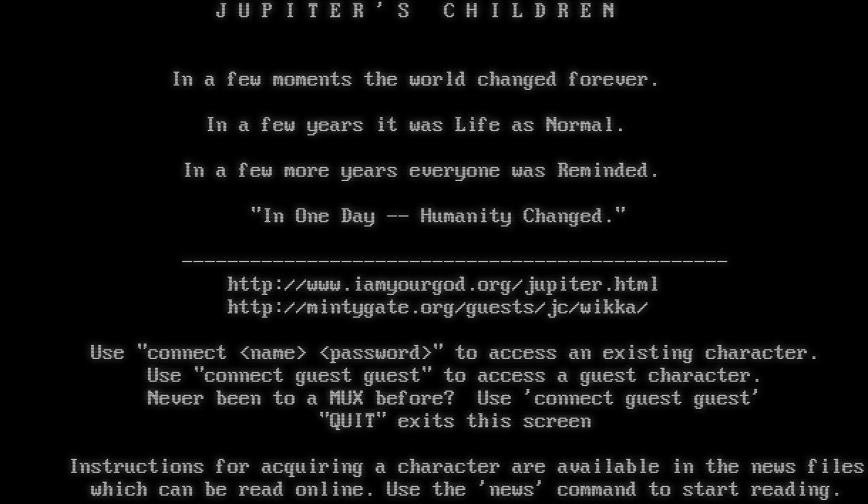 J U P I T E R ' S C H I L D R E N In a few moments the world changed forever. In a few years it was Life as Normal. In a few more years everyone was Reminded. "In One Day -- Humanity Changed." -​----------------------------------------------- http://www.iamyourgod.org/jupiter.html http://mintygate.org/guests/jc/wikka/ Use "connect <name> <password>" to access an existing character. Use "connect guest guest" to access a guest character. Never been to a MUX before? Use 'connect guest guest' "QUIT" exits this screen Instructions for acquiring a character are available in the news files which can be read online. Use the 'news' command to start reading.