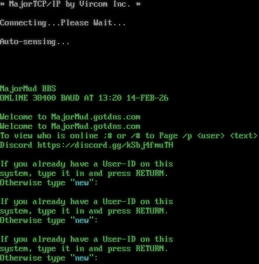 \* MajorTCP/IP by Vircom Inc. \* Connecting...Please Wait... Auto-sensing... ! WELCOME! MajorMud BBS ONLINE 38400 BAUD AT 13:20 14-FEB-26 Welcome to MajorMud.gotdns.com Welcome to MajorMud.gotdns.com To view who is online ;# or /# to Page /p <user> <text> Discord https://discord.gg/kSbj4fmuTH If you already have a User-ID on this system, type it in and press RETURN. Otherwise type "new": If you already have a User-ID on this system, type it in and press RETURN. Otherwise type "new": If you already have a User-ID on this system, type it in and press RETURN. Otherwise type "new":