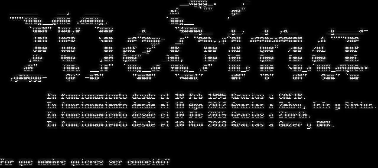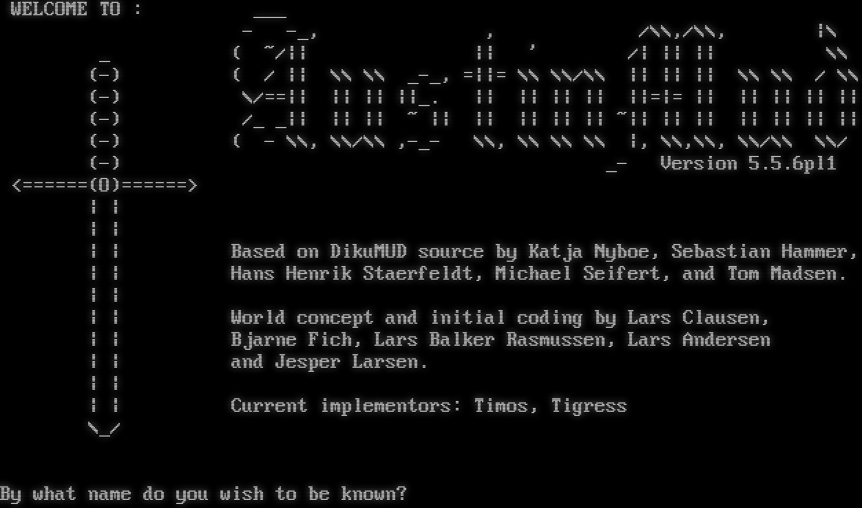 WELCOME TO : ___ - -_, , /\\\\,/\\\\, \|\\ _ ( ~/\|\| \|\| ' /\| \|\| \|\| \\\\ (-) ( / \|\| \\\\ \\\\ _-_, =\|\|= \\\\ \\\\/\\\\ \|\| \|\| \|\| \\\\ \\\\ / \\\\ (-) \\/==\|\| \|\| \|\| \|\|_. \|\| \|\| \|\| \|\| \|\|=\|= \|\| \|\| \|\| \|\| \|\| (-) /_ _\|\| \|\| \|\| ~ \|\| \|\| \|\| \|\| \|\| ~\|\| \|\| \|\| \|\| \|\| \|\| \|\| (-) ( - \\\\, \\\\/\\\\ ,-_- \\\\, \\\\ \\\\ \\\\ \|, \\\\,\\\\, \\\\/\\\\ \\\\/ (-) _- Version 5.5.6pl1 <=​=====(O)=​=====> \| \| \| \| \| \| Based on DikuMUD source by Katja Nyboe, Sebastian Hammer, \| \| Hans Henrik Staerfeldt, Michael Seifert, and Tom Madsen. \| \| \| \| World concept and initial coding by Lars Clausen, \| \| Bjarne Fich, Lars Balker Rasmussen, Lars Andersen \| \| and Jesper Larsen. \| \| \| \| Current implementors: Timos, Tigress \\_/ By what name do you wish to be known?