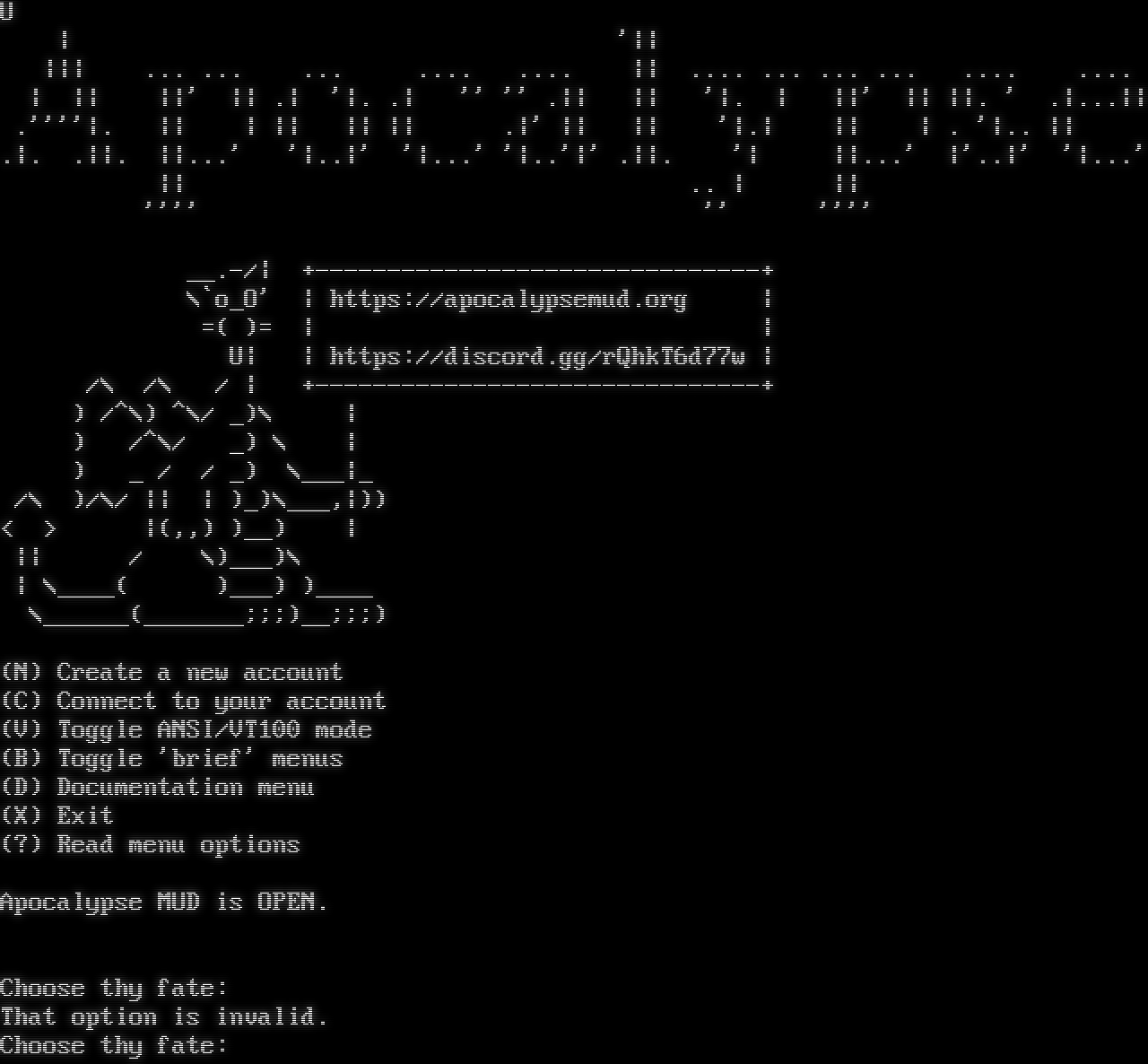 U \| '\|\| \|\|\| ... ... ... .​... .​... \|\| .​... ... ... ... .​... .​... \| \|\| \|\|' \|\| .\| '\|. .\| '' '' .\|\| \|\| '\|. \| \|\|' \|\| \|\|. ' .\|...\|\| .''''\|. \|\| \| \|\| \|\| \|\| .\|' \|\| \|\| '\|.\| \|\| \| . '\|.. \|\| .\|. .\|\|. \|\|...' '\|..\|' '\|...' '\|..'\|' .\|\|. '\| \|\|...' \|'..\|' '\|...' \|\| .. \| \|\| '''' '' '''' _​_.-/\| +​-------------------------------+ \\\`o_O' \| https://apocalypsemud.org \| =( )= \| \| U\| \| https://discord.gg/rQhkT6d77w \| /\\ /\\ / \| +​-------------------------------+ ) /^\\) ^\\/ _)\\ \| ) /^\\/ _) \\ \| ) _ / / _) \\___\|_ /\\ )/\\/ \|\| \| )_)\\___,\|)) < > \|(,,) )__) \| \|\| / \\)___)\\ \| \\_​___( )___) )_​___ \\_​_____(_​______;;;)__;;;) (N) Create a new account (C) Connect to your account (V) Toggle ANSI/VT100 mode (B) Toggle 'brief' menus (D) Documentation menu (X) Exit (?) Read menu options Apocalypse MUD is OPEN. Choose thy fate: That option is invalid. Choose thy fate: