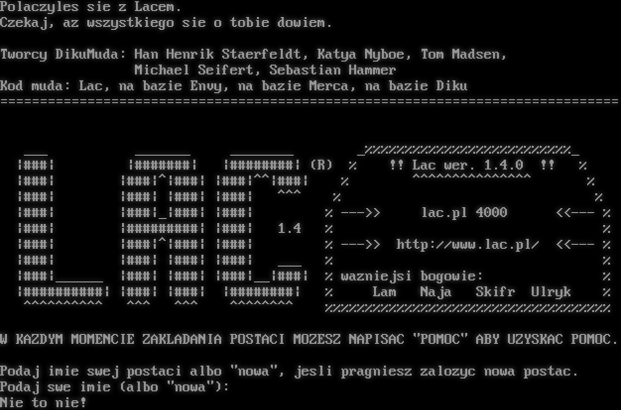 Polaczyles sie z Lacem. Czekaj, az wszystkiego sie o tobie dowiem. Tworcy DikuMuda: Han Henrik Staerfeldt, Katya Nyboe, Tom Madsen, Michael Seifert, Sebastian Hammer Kod muda: Lac, na bazie Envy, na bazie Merca, na bazie Diku =​============================================================================= ___ _​______ _​_______ _%%%%%%%%%%%%%%%%%%%%%%%%%%_ \|###\| \|#​######\| \|#​#######\| (R) % !! Lac wer. 1.4.0 !! % \|###\| \|###\|^\|###\| \|###\|^^\|###\| % ^​^^^^^^^^^^^^^^ % \|###\| \|###\| \|###\| \|###\| ^^^ % % \|###\| \|###\|_\|###\| \|###\| % --->> lac.pl 4000 <<--- % \|###\| \|#​########\| \|###\| 1.4 % % \|###\| \|###\|^\|###\| \|###\| % --->> http://www.lac.pl/ <<--- % \|###\| \|###\| \|###\| \|###\| ___ % % \|###\|_​_____ \|###\| \|###\| \|###\|__\|###\| % wazniejsi bogowie: % \|#​#########\| \|###\| \|###\| \|#​#######\| % Lam Naja Skifr Ulryk % ^​^^^^^^^^^ ^^^ ^^^ ^​^^^^^^^ %%%%%%%%%%%%%%%%%%%%%%%%%%%%%%%%%%%% W KAZDYM MOMENCIE ZAKLADANIA POSTACI MOZESZ NAPISAC "POMOC" ABY UZYSKAC POMOC. Podaj imie swej postaci albo "nowa", jesli pragniesz zalozyc nowa postac. Podaj swe imie (albo "nowa"): Nie to nie!