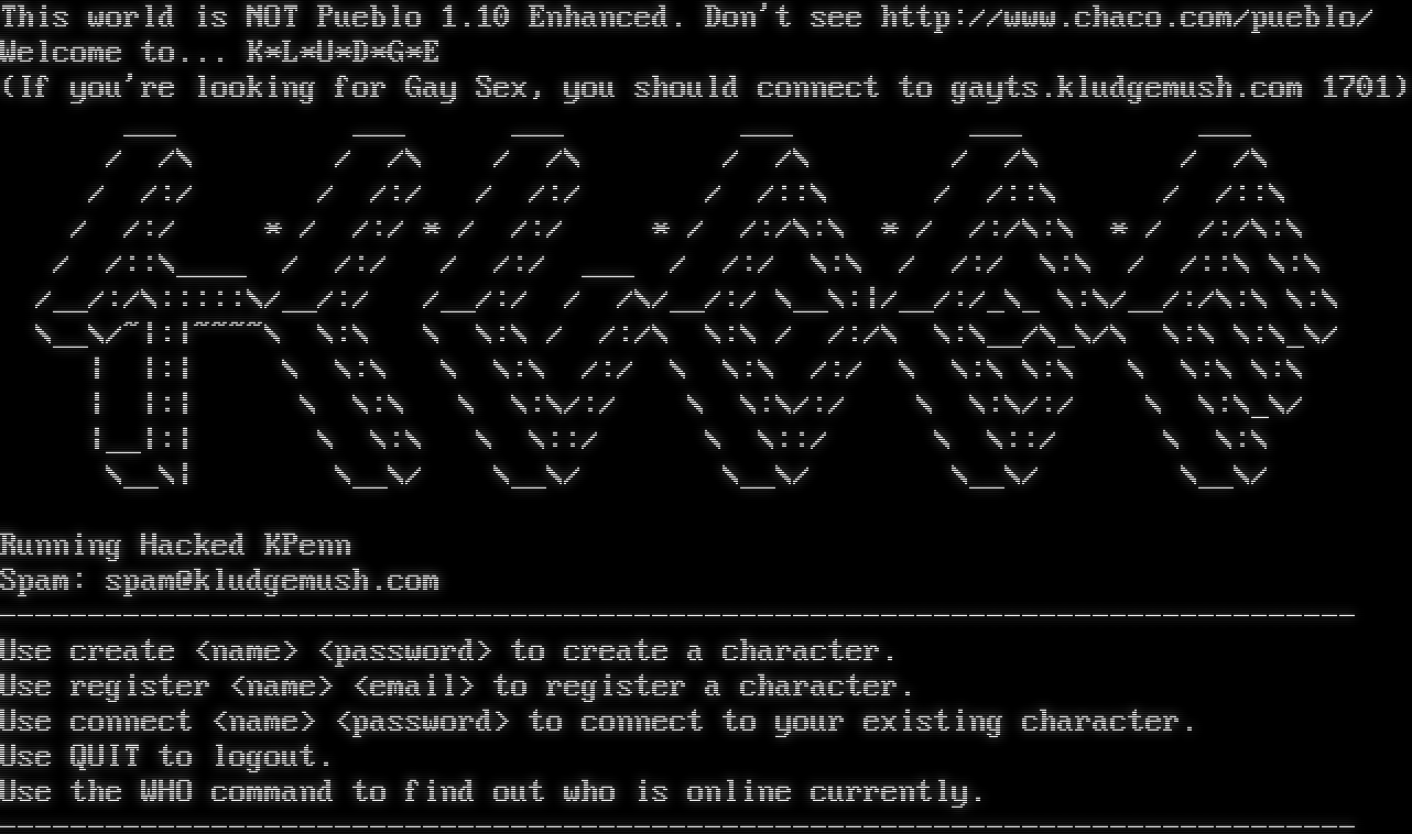 This world is NOT Pueblo 1.10 Enhanced. Don't see http://www.chaco.com/pueblo/ Welcome to... K\*L\*U\*D\*G\*E (If you're looking for Gay Sex, you should connect to gayts.kludgemush.com 1701) ___ ___ ___ ___ ___ ___ / /\\ / /\\ / /\\ / /\\ / /\\ / /\\ / /:/ / /:/ / /:/ / /::\\ / /::\\ / /::\\ / /:/ \* / /:/ \* / /:/ \* / /:/\\:\\ \* / /:/\\:\\ \* / /:/\\:\\ / /::\\_​___ / /:/ / /:/ ___ / /:/ \\:\\ / /:/ \\:\\ / /::\\ \\:\\ /__/:/\\:::::\\/__/:/ /__/:/ / /\\/__/:/ \\__\\:\|/__/:/_\\_ \\:\\/__/:/\\:\\ \\:\\ \\__\\/~\|:\|~​~~~\\ \\:\\ \\ \\:\\ / /:/\\ \\:\\ / /:/\\ \\:\\__/\\_\\/\\ \\:\\ \\:\\_\\/ \| \|:\| \\ \\:\\ \\ \\:\\ /:/ \\ \\:\\ /:/ \\ \\:\\ \\:\\ \\ \\:\\ \\:\\ \| \|:\| \\ \\:\\ \\ \\:\\/:/ \\ \\:\\/:/ \\ \\:\\/:/ \\ \\:\\_\\/ \|__\|:\| \\ \\:\\ \\ \\::/ \\ \\::/ \\ \\::/ \\ \\:\\ \\__\\\| \\__\\/ \\__\\/ \\__\\/ \\__\\/ \\__\\/ Running Hacked KPenn Spam: spam@kludgemush.com -​---------------------------------------------------------------------------- Use create <name> <password> to create a character. Use register <name> <email> to register a character. Use connect <name> <password> to connect to your existing character. Use QUIT to logout. Use the WHO command to find out who is online currently. -​----------------------------------------------------------------------------