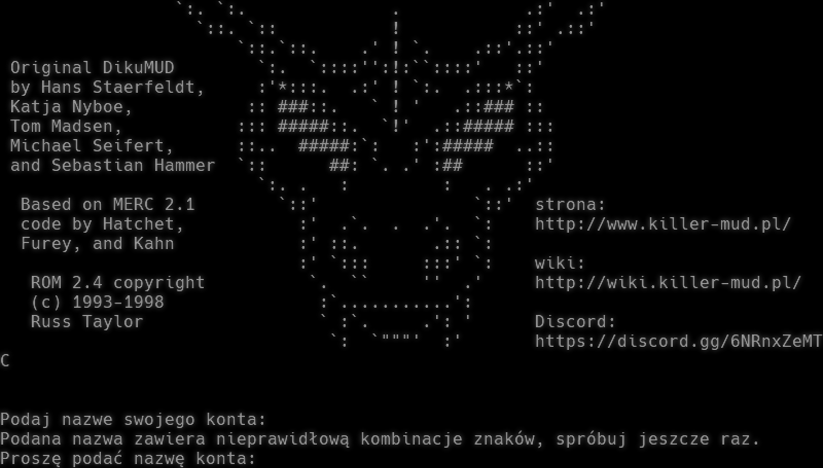.:' K I L L E R \`:. ::' \`:: :: :. < killer-mud.pl 3003 > .: :: \`:. \`:. . .:' .:' \`::. \`:: ! ::' .::' \`::.\`::. .' ! \`. .::'.::' Original DikuMUD \`:. \`::::'':!:\`\`::::' ::' by Hans Staerfeldt, :'\*:::. .:' ! \`:. .:::\*\`: Katja Nyboe, :: ###::. \` ! ' .::### :: Tom Madsen, ::: #​####::. \`!' .::#​#### ::: Michael Seifert, ::.. #​####:\`: :':#​#### ..:: and Sebastian Hammer \`:: ##: \`. .' :## ::' \`:. . : : . .:' Based on MERC 2.1 \`::' \`::' strona: code by Hatchet, :' .\`. . .'. \`: http://www.killer-mud.pl/ Furey, and Kahn :' ::. .:: \`: :' \`::: :::' \`: wiki: ROM 2.4 copyright \`. \`\` '' .' http://wiki.killer-mud.pl/ (c) 1993-1998 :\`.​..........': Russ Taylor \` :\`. .': ' Discord: \`: \`"""' :' https://discord.gg/6NRnxZeMTC Podaj nazwe swojego konta: Podana nazwa zawiera nieprawidłową kombinacje znaków, spróbuj jeszcze raz. Proszę podać nazwę konta: