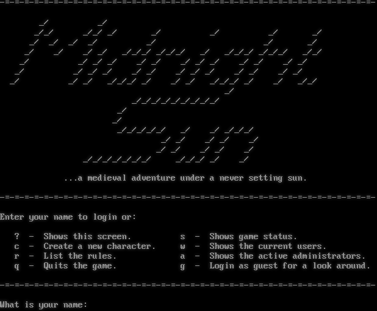 -​=-=-=-=-=-=-=-=-=-=-=-=-=-=-=-=-=-=-=-=-=-=-=-=-=-=-=-=-=-=-=-=-=-=-=-=-=-=- _/ _/ _/_/ _/_/ _/ _/ _/ _/ _/ _/ _/ _/ _/ _/ _/ _/ _/ _/ _/ _/ _/_/_/ _/_/_/ _/ _/_/_/ _/_/_/ _/_/ _/ _/ _/ _/ _/ _/ _/ _/ _/ _/ _/ _/ _/ _/ _/ _/ _/ _/ _/ _/ _/ _/ _/ _/ _/ _/ _/ _/ _/ _/_/_/ _/ _/ _/ _/_/_/ _/ _/ _/_/ _/ _/_/_/_/_/_/_/_/_/ _/ _/ _/_/_/_/_/ _/ _/ _/_/_/ _/ _/ _/ _/ _/ _/ _/ _/ _/ _/ _/_/_/_/_/_/_/ _/_/_/ _/ _/ ...a medieval adventure under a never setting sun. -​=-=-=-=-=-=-=-=-=-=-=-=-=-=-=-=-=-=-=-=-=-=-=-=-=-=-=-=-=-=-=-=-=-=-=-=-=-=- Enter your name to login or: ? - Shows this screen. s - Shows game status. c - Create a new character. w - Shows the current users. r - List the rules. a - Shows the active administrators. q - Quits the game. g - Login as guest for a look around. -​=-=-=-=-=-=-=-=-=-=-=-=-=-=-=-=-=-=-=-=-=-=-=-=-=-=-=-=-=-=-=-=-=-=-=-=-=-=- What is your name: